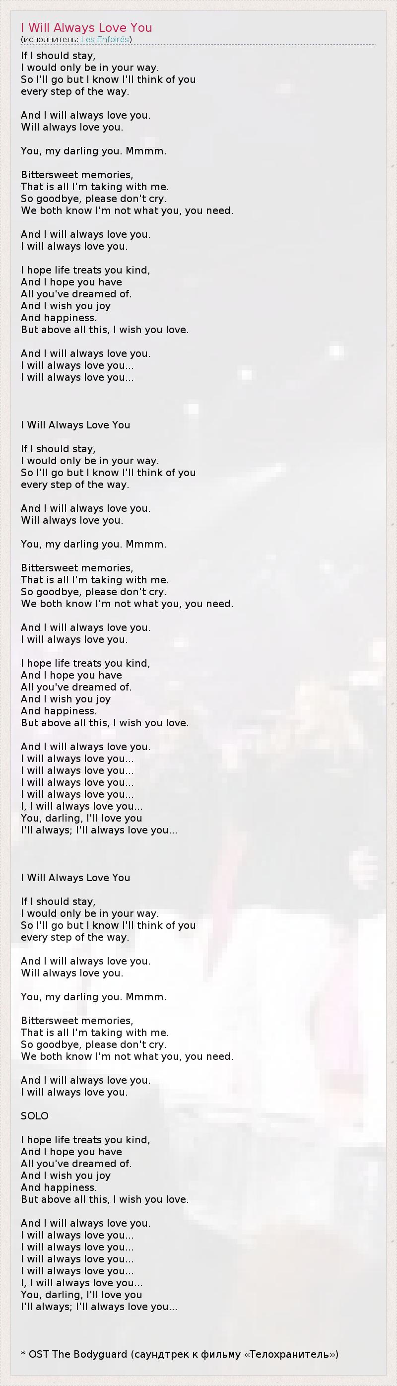 If I should stay, I would only be in your way. So I'll go but I know I'll think of you every step of the way. And I will always love you. Will always love you. You, my darling you. Mmmm. Bittersweet memories, That is all I'm taking with me. So goodbye, please don't cry. We both know I'm not what you, you need. And I will always love you. I will always love you. I hope life treats you kind, And I hope you have All you've dreamed of. And I wish you joy And happiness. But above all this, I wish you love. And I will always love you. I will always love you... I will always love you... I Will Always Love You If I should stay, I would only be in your way. So I'll go but I know I'll think of you every step of the way. And I will always love you. Will always love you. You, my darling you. Mmmm. Bittersweet memories, That is all I'm taking with me. So goodbye, please don't cry. We both know I'm not what you, you need. And I will always love you. I will always love you. I hope life treats you kind, And I hope you have All you've dreamed of. And I wish you joy And happiness. But above all this, I wish you love. And I will always love you. I will always love you... I will always love you... I will always love you... I will always love you... I, I will always love you... You, darling, I'll love you I'll always; I'll always love you... I Will Always Love You If I should stay, I would only be in your way. So I'll go but I know I'll think of you every step of the way. And I will always love you. Will always love you. You, my darling you. Mmmm. Bittersweet memories, That is all I'm taking with me. So goodbye, please don't cry. We both know I'm not what you, you need. And I will always love you. I will always love you. SOLO I hope life treats you kind, And I hope you have All you've dreamed of. And I wish you joy And happiness. But above all this, I wish you love. And I will always love you. I will always love you... I will always love you... I will always love you... I will always love you... I, I will always love you... You, darling, I'll love you I'll always; I'll always love you... * OST The Bodyguard (саундтрек к фильму «Телохранитель»)