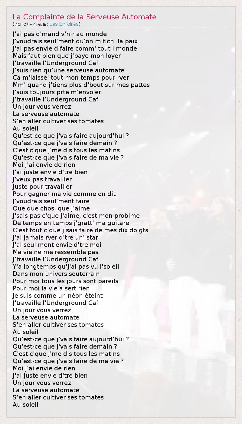 А как ты думаешь, о чем песня "La Complainte de la Serveuse Automate" ?
