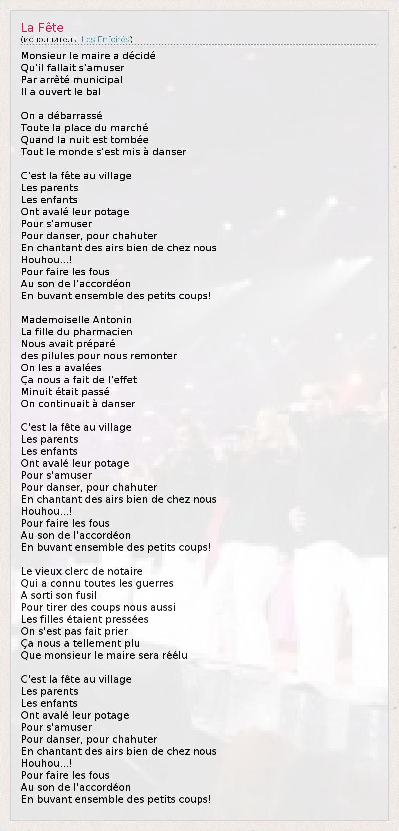 Месье мэр решил, Что нужно развлечься, Муниципальным постановлением. Он открыл бал. Освободили Все пространство площади. Когда настала ночь, Все принялись танцевать. Это праздник в деревне. Родители, Дети Проглотили суп. Чтобы развлекаться, Чтобы танцевать, чтобы шуметь, Распевая народные мелодии. Хуху...! Чтобы подурачиться Под звуки аккордеона, Вместе выпивая! Мадмуазель Антонин, Дочь аптекаря, Приготовила нам Пилюли, чтобы нас поднять на ноги. Мы их проглотили, На нас это подействовало. Полночь миновала, Мы продолжали танцевать. Это праздник в деревне. Родители, Дети Проглотили суп. Чтобы развлекаться, Чтобы танцевать, чтобы шуметь, Распевая народные мелодии. Хуху...! Чтобы подурачиться Под звуки аккордеона, Вместе выпивая! Старый служака нотариуса, Что познал все войны, Достал свое ружье, Чтобы выстрелить и в нас. Девушки мучились, Мы не молились. Это нам действительно понравилось, То, что месье мэр будет переизбран. Это праздник в деревне. Родители, Дети Проглотили суп. Чтобы развлекаться, Чтобы танцевать, чтобы шуметь, Распевая народные мелодии. Хуху...! Чтобы подурачиться Под звуки аккордеона, Вместе выпивая!