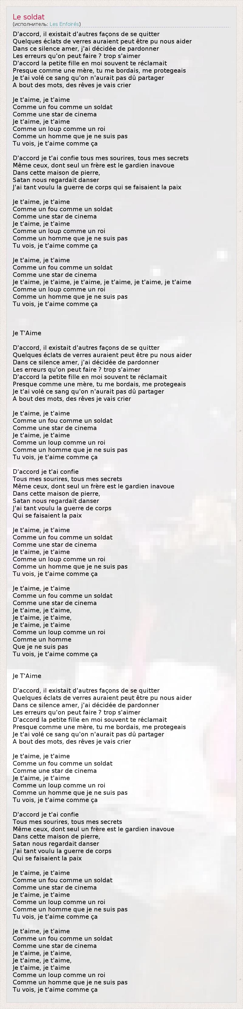 D'accord, il existait d'autres façons de se quitter Quelques éclats de verres auraient peut être pu nous aider Dans ce silence amer, j'ai décidée de pardonner Les erreurs qu'on peut faire ? trop s'aimer D'accord la petite fille en moi souvent te réclamait Presque comme une mère, tu me bordais, me protegeais Je t'ai volé ce sang qu'on n'aurait pas dû partager A bout des mots, des rêves je vais crier Je t'aime, je t'aime Comme un fou comme un soldat Comme une star de cinema Je t'aime, je t'aime Comme un loup comme un roi Comme un homme que je ne suis pas Tu vois, je t'aime comme ça D'accord je t'ai confie tous mes sourires, tous mes secrets Même ceux, dont seul un frère est le gardien inavoue Dans cette maison de pierre, Satan nous regardait danser J'ai tant voulu la guerre de corps qui se faisaient la paix Je t'aime, je t'aime Comme un fou comme un soldat Comme une star de cinema Je t'aime, je t'aime Comme un loup comme un roi Comme un homme que je ne suis pas Tu vois, je t'aime comme ça Je t'aime, je t'aime Comme un fou comme un soldat Comme une star de cinema Je t'aime, je t'aime, je t'aime, je t'aime, je t'aime, je t'aime Comme un loup comme un roi Comme un homme que je ne suis pas Tu vois, je t'aime comme ça Je T'Aime D'accord, il existait d'autres façons de se quitter Quelques éclats de verres auraient peut être pu nous aider Dans ce silence amer, j'ai décidée de pardonner Les erreurs qu'on peut faire ? trop s'aimer D'accord la petite fille en moi souvent te réclamait Presque comme une mère, tu me bordais, me protegeais Je t'ai volé ce sang qu'on n'aurait pas dû partager A bout des mots, des rêves je vais crier Je t'aime, je t'aime Comme un fou comme un soldat Comme une star de cinema Je t'aime, je t'aime Comme un loup comme un roi Comme un homme que je ne suis pas Tu vois, je t'aime comme ça D'accord je t'ai confie Tous mes sourires, tous mes secrets Même ceux, dont seul un frère est le gardien inavoue Dans cette maison de pierre, Satan nous regardait danser J'ai tant voulu la guerre de corps Qui se faisaient la paix Je t'aime, je t'aime Comme un fou comme un soldat Comme une star de cinema Je t'aime, je t'aime Comme un loup comme un roi Comme un homme que je ne suis pas Tu vois, je t'aime comme ça Je t'aime, je t'aime Comme un fou comme un soldat Comme une star de cinema Je t'aime, je t'aime, Je t'aime, je t'aime, Je t'aime, je t'aime Comme un loup comme un roi Comme un homme Que je ne suis pas Tu vois, je t'aime comme ça Je T'Aime D'accord, il existait d'autres façons de se quitter Quelques éclats de verres auraient peut être pu nous aider Dans ce silence amer, j'ai décidée de pardonner Les erreurs qu'on peut faire ? trop s'aimer D'accord la petite fille en moi souvent te réclamait Presque comme une mère, tu me bordais, me protegeais Je t'ai volé ce sang qu'on n'aurait pas dû partager A bout des mots, des rêves je vais crier Je t'aime, je t'aime Comme un fou comme un soldat Comme une star de cinema Je t'aime, je t'aime Comme un loup comme un roi Comme un homme que je ne suis pas Tu vois, je t'aime comme ça D'accord je t'ai confie Tous mes sourires, tous mes secrets Même ceux, dont seul un frère est le gardien inavoue Dans cette maison de pierre, Satan nous regardait danser J'ai tant voulu la guerre de corps Qui se faisaient la paix Je t'aime, je t'aime Comme un fou comme un soldat Comme une star de cinema Je t'aime, je t'aime Comme un loup comme un roi Comme un homme que je ne suis pas Tu vois, je t'aime comme ça Je t'aime, je t'aime Comme un fou comme un soldat Comme une star de cinema Je t'aime, je t'aime, Je t'aime, je t'aime, Je t'aime, je t'aime Comme un loup comme un roi Comme un homme que je ne suis pas Tu vois, je t'aime comme ça