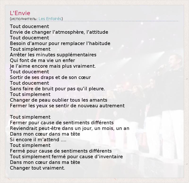 Это интересно:"Les Enfoirés" (Лез Анфуаре) ("Глупцы") - одно из замечательнейших событий в жизни французской музыки. Ежегодно группа артистов собирается вместе, чтобы дать серию благотворительных концертов. Собранные средства направляются в фонд "Ресторанчиков сердца" ("Restaurants de coeur"), в которых нищие и обездоленные всегда могут найти порцию вкусного и бесплатного обеда.Идея создания... продолжение