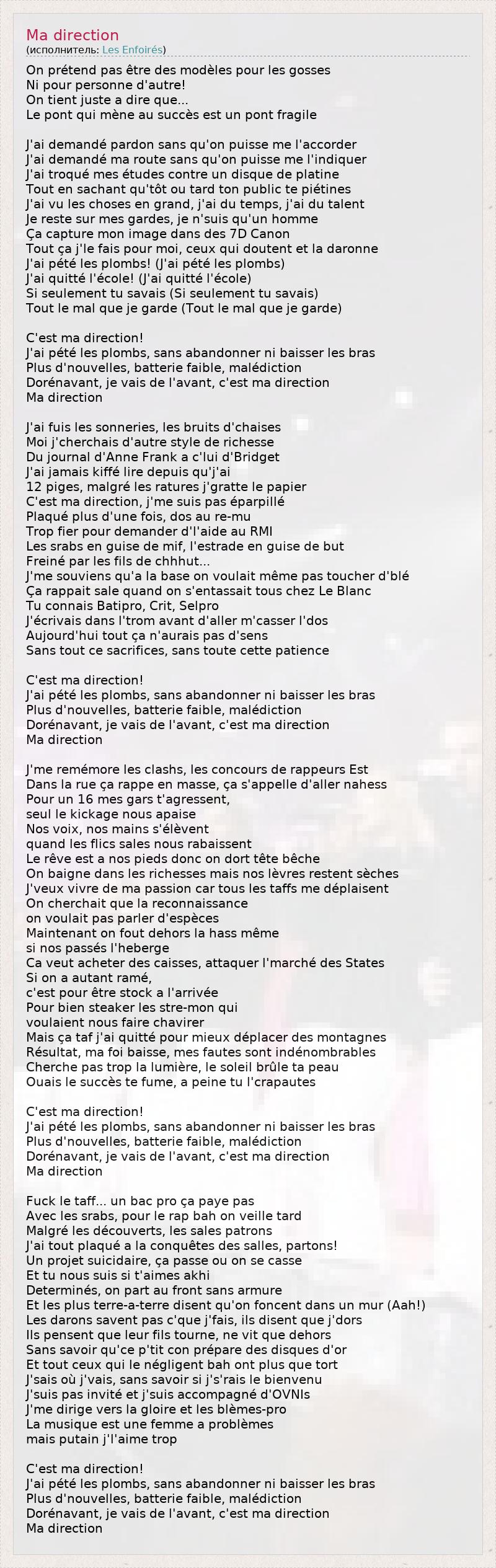 On prétend pas être des modèles pour les gosses Ni pour personne d'autre! On tient juste a dire que... Le pont qui mène au succès est un pont fragile J'ai demandé pardon sans qu'on puisse me l'accorder J'ai demandé ma route sans qu'on puisse me l'indiquer J'ai troqué mes études contre un disque de platine Tout en sachant qu'tôt ou tard ton public te piétines J'ai vu les choses en grand, j'ai du temps, j'ai du talent Je reste sur mes gardes, je n'suis qu'un homme Ça capture mon image dans des 7D Canon Tout ça j'le fais pour moi, ceux qui doutent et la daronne J'ai pété les plombs! (J'ai pété les plombs) J'ai quitté l'école! (J'ai quitté l'école) Si seulement tu savais (Si seulement tu savais) Tout le mal que je garde (Tout le mal que je garde) C'est ma direction! J'ai pété les plombs, sans abandonner ni baisser les bras Plus d'nouvelles, batterie faible, malédiction Dorénavant, je vais de l'avant, c'est ma direction Ma direction J'ai fuis les sonneries, les bruits d'chaises Moi j'cherchais d'autre style de richesse Du journal d'Anne Frank a c'lui d'Bridget J'ai jamais kiffé lire depuis qu'j'ai 12 piges, malgré les ratures j'gratte le papier C'est ma direction, j'me suis pas éparpillé Plaqué plus d'une fois, dos au re-mu Trop fier pour demander d'l'aide au RMI Les srabs en guise de mif, l'estrade en guise de but Freiné par les fils de chhhut... J'me souviens qu'a la base on voulait même pas toucher d'blé Ça rappait sale quand on s'entassait tous chez Le Blanc Tu connais Batipro, Crit, Selpro J'écrivais dans l'trom avant d'aller m'casser l'dos Aujourd'hui tout ça n'aurais pas d'sens Sans tout ce sacrifices, sans toute cette patience C'est ma direction! J'ai pété les plombs, sans abandonner ni baisser les bras Plus d'nouvelles, batterie faible, malédiction Dorénavant, je vais de l'avant, c'est ma direction Ma direction J'me remémore les clashs, les concours de rappeurs Est Dans la rue ça rappe en masse, ça s'appelle d'aller nahess Pour un 16 mes gars t'agressent, seul le kickage nous apaise Nos voix, nos mains s'élèvent quand les flics sales nous rabaissent Le rêve est a nos pieds donc on dort tête bêche On baigne dans les richesses mais nos lèvres restent sèches J'veux vivre de ma passion car tous les taffs me déplaisent On cherchait que la reconnaissance on voulait pas parler d'espèces Maintenant on fout dehors la hass même si nos passés l'heberge Ca veut acheter des caisses, attaquer l'marché des States Si on a autant ramé, c'est pour être stock a l'arrivée Pour bien steaker les stre-mon qui voulaient nous faire chavirer Mais ça taf j'ai quitté pour mieux déplacer des montagnes Résultat, ma foi baisse, mes fautes sont indénombrables Cherche pas trop la lumière, le soleil brûle ta peau Ouais le succès te fume, a peine tu l'crapautes C'est ma direction! J'ai pété les plombs, sans abandonner ni baisser les bras Plus d'nouvelles, batterie faible, malédiction Dorénavant, je vais de l'avant, c'est ma direction Ma direction Fuck le taff... un bac pro ça paye pas Avec les srabs, pour le rap bah on veille tard Malgré les découverts, les sales patrons J'ai tout plaqué a la conquêtes des salles, partons! Un projet suicidaire, ça passe ou on se casse Et tu nous suis si t'aimes akhi Determinés, on part au front sans armure Et les plus terre-a-terre disent qu'on foncent dans un mur (Aah!) Les darons savent pas c'que j'fais, ils disent que j'dors Ils pensent que leur fils tourne, ne vit que dehors Sans savoir qu'ce p'tit con prépare des disques d'or Et tout ceux qui le négligent bah ont plus que tort J'sais où j'vais, sans savoir si j's'rais le bienvenu J'suis pas invité et j'suis accompagné d'OVNIs J'me dirige vers la gloire et les blèmes-pro La musique est une femme a problèmes mais putain j'l'aime trop C'est ma direction! J'ai pété les plombs, sans abandonner ni baisser les bras Plus d'nouvelles, batterie faible, malédiction Dorénavant, je vais de l'avant, c'est ma direction Ma direction