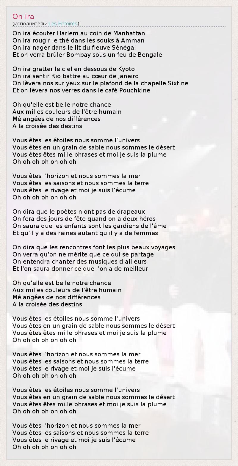 Это интересно:"Les Enfoirés" (Лез Анфуаре) ("Глупцы") - одно из замечательнейших событий в жизни французской музыки. Ежегодно группа артистов собирается вместе, чтобы дать серию благотворительных концертов. Собранные средства направляются в фонд "Ресторанчиков сердца" ("Restaurants de coeur"), в которых нищие и обездоленные всегда могут найти порцию вкусного и бесплатного обеда.Идея создания... продолжение