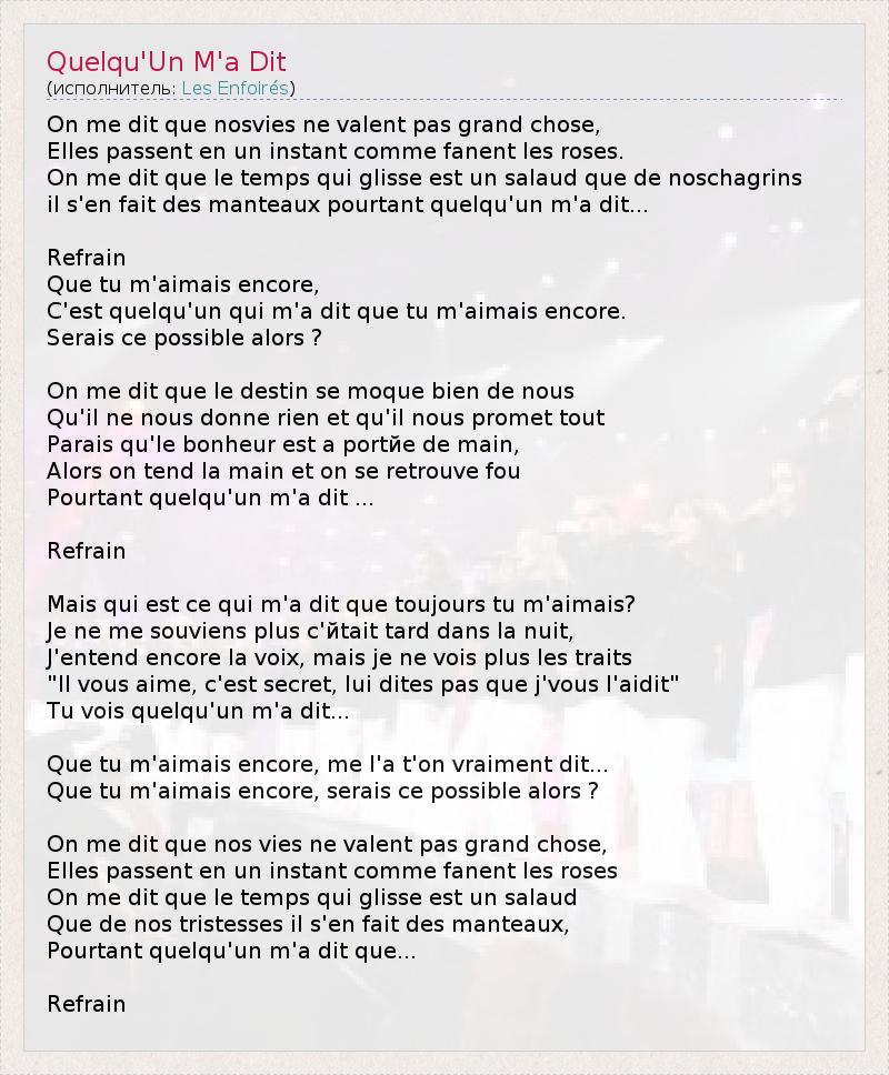 On me dit que nosvies ne valent pas grand chose, Elles passent en un instant comme fanent les roses. On me dit que le temps qui glisse est un salaud que de noschagrins il s'en fait des manteaux pourtant quelqu'un m'a dit... Refrain Que tu m'aimais encore, C'est quelqu'un qui m'a dit que tu m'aimais encore. Serais ce possible alors ? On me dit que le destin se moque bien de nous Qu'il ne nous donne rien et qu'il nous promet tout Parais qu'le bonheur est а portйe de main, Alors on tend la main et on se retrouve fou Pourtant quelqu'un m'a dit ... Refrain Mais qui est ce qui m'a dit que toujours tu m'aimais? Je ne me souviens plus c'йtait tard dans la nuit, J'entend encore la voix, mais je ne vois plus les traits "Il vous aime, c'est secret, lui dites pas que j'vous l'aidit" Tu vois quelqu'un m'a dit... Que tu m'aimais encore, me l'a t'on vraiment dit... Que tu m'aimais encore, serais ce possible alors ? On me dit que nos vies ne valent pas grand chose, Elles passent en un instant comme fanent les roses On me dit que le temps qui glisse est un salaud Que de nos tristesses il s'en fait des manteaux, Pourtant quelqu'un m'a dit que... Refrain
