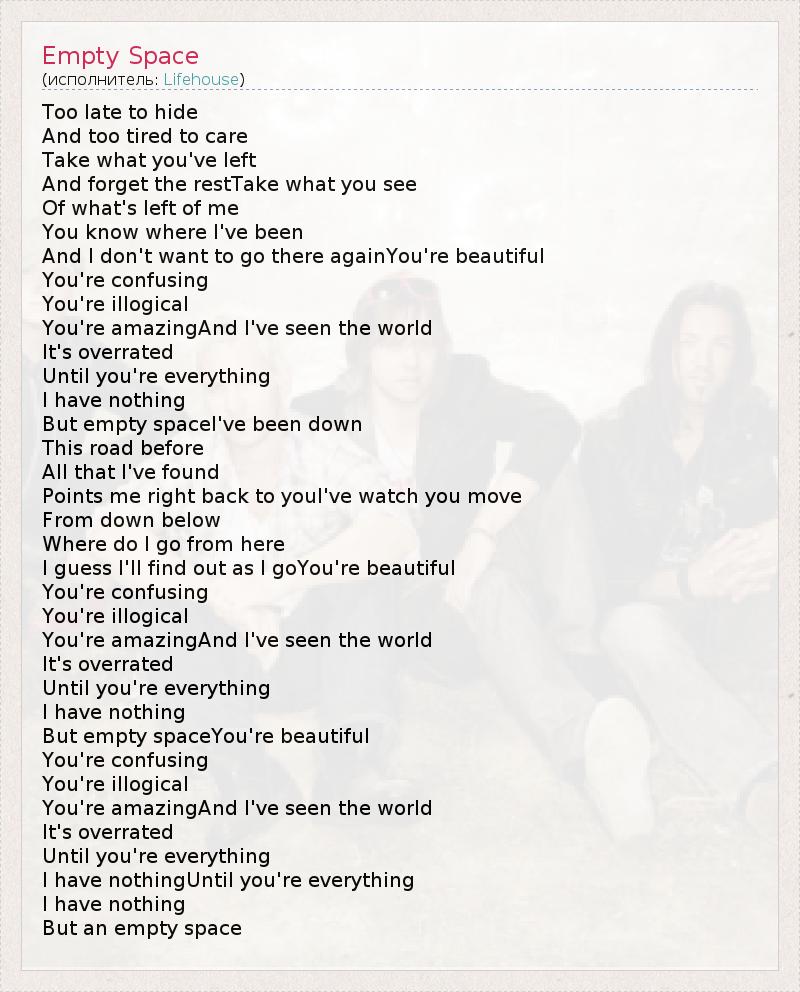 Too late to hide And too tired to care Take what you've left And forget the restTake what you see Of what's left of me You know where I've been And I don't want to go there againYou're beautiful You're confusing You're illogical You're amazingAnd I've seen the world It's overrated Until you're everything I have nothing But empty spaceI've been down This road before All that I've found Points me right back to youI've watch you move From down below Where do I go from here I guess I'll find out as I goYou're beautiful You're confusing You're illogical You're amazingAnd I've seen the world It's overrated Until you're everything I have nothing But empty spaceYou're beautiful You're confusing You're illogical You're amazingAnd I've seen the world It's overrated Until you're everything I have nothingUntil you're everything I have nothing But an empty space
