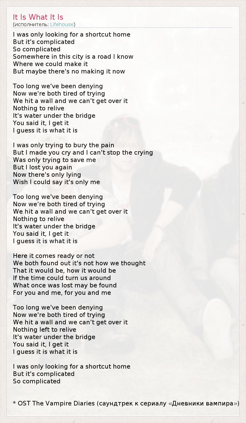 I was only looking for a shortcut home But it's complicated So complicated Somewhere in this city is a road I know Where we could make it But maybe there's no making it now Too long we've been denying Now we're both tired of trying We hit a wall and we can't get over it Nothing to relive It's water under the bridge You said it, I get it I guess it is what it is I was only trying to bury the pain But I made you cry and I can't stop the crying Was only trying to save me But I lost you again Now there's only lying Wish I could say it's only me Too long we've been denying Now we're both tired of trying We hit a wall and we can't get over it Nothing to relive It's water under the bridge You said it, I get it I guess it is what it is Here it comes ready or not We both found out it's not how we thought That it would be, how it would be If the time could turn us around What once was lost may be found For you and me, for you and me Too long we've been denying Now we're both tired of trying We hit a wall and we can't get over it Nothing left to relive It's water under the bridge You said it, I get it I guess it is what it is I was only looking for a shortcut home But it's complicated So complicated * OST The Vampire Diaries (саундтрек к сериалу «Дневники вампира»)