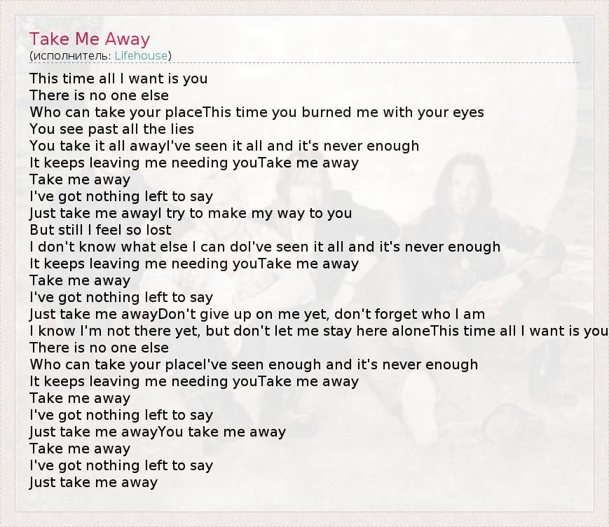 This time all I want is you There is no one else Who can take your placeThis time you burned me with your eyes You see past all the lies You take it all awayI've seen it all and it's never enough It keeps leaving me needing youTake me away Take me away I've got nothing left to say Just take me awayI try to make my way to you But still I feel so lost I don't know what else I can doI've seen it all and it's never enough It keeps leaving me needing youTake me away Take me away I've got nothing left to say Just take me awayDon't give up on me yet, don't forget who I am I know I'm not there yet, but don't let me stay here aloneThis time all I want is you There is no one else Who can take your placeI've seen enough and it's never enough It keeps leaving me needing youTake me away Take me away I've got nothing left to say Just take me awayYou take me away Take me away I've got nothing left to say Just take me away