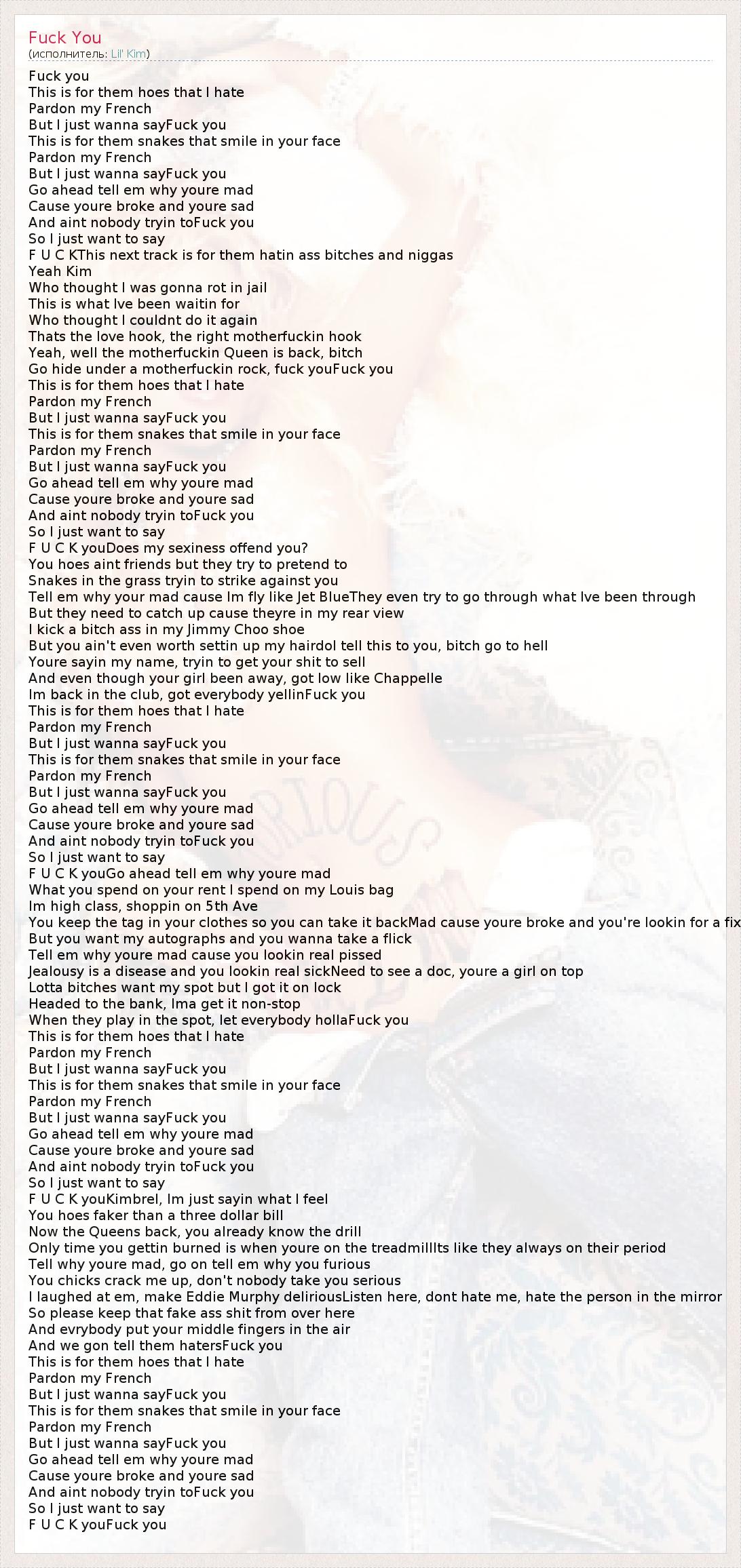 Это интересно:Имя: Kimberly Denise Jones.Псевдоним: Lil' Kim.Дата и место рождения: 11 июля 1975 года, Бруклин, Нью-Йорк.После развода родителей, когда Ким было 9 лет, она стала жить с отцом. Изначально Ким и ее старший брат Кристофер, жили с матерью, до тех пор, пока опека над детьми не была передана её отцу. Ким была непослушным ребёнком, но ей приходилось жить по строгим правила её отца, из-за чего, они постоянно... продолжение