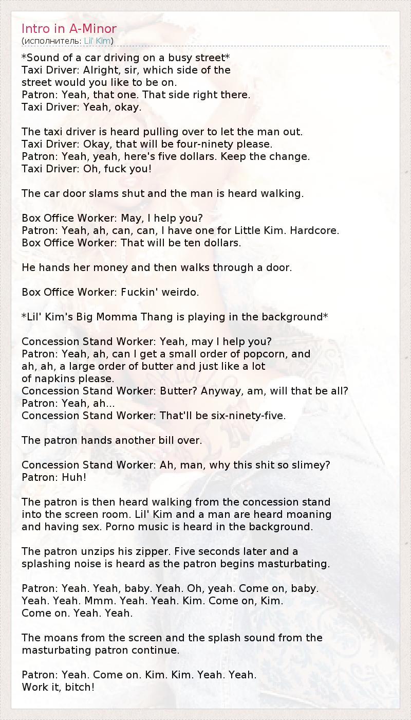 into the screen room. Lil' Kim and a man are heard moaning