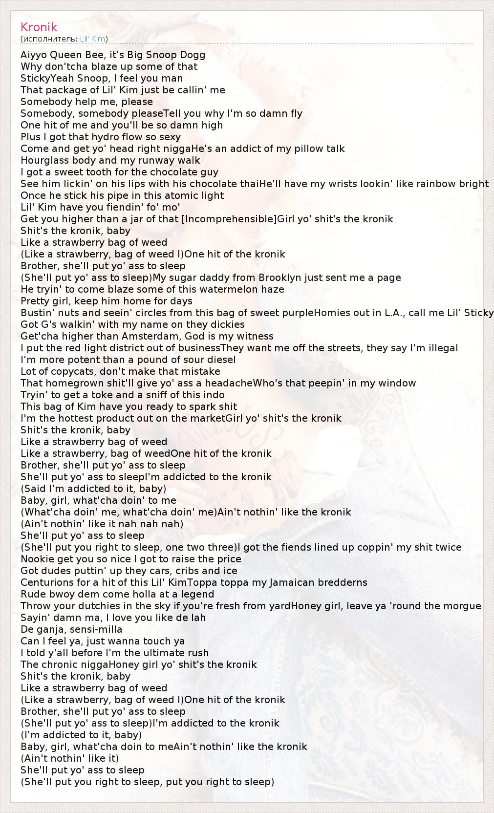 She'll put yo' ass to sleepI'm addicted to the kronik