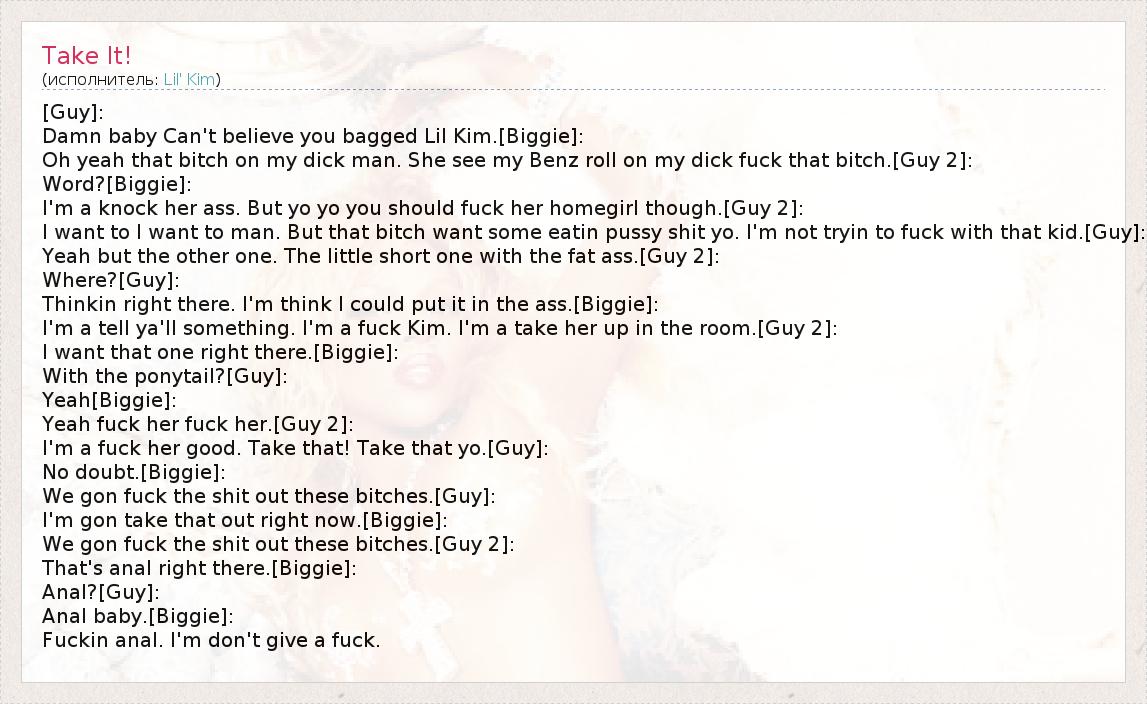 Это интересно:Имя: Kimberly Denise Jones.Псевдоним: Lil' Kim.Дата и место рождения: 11 июля 1975 года, Бруклин, Нью-Йорк.После развода родителей, когда Ким было 9 лет, она стала жить с отцом. Изначально Ким и ее старший брат Кристофер, жили с матерью, до тех пор, пока опека над детьми не была передана её отцу. Ким была непослушным ребёнком, но ей приходилось жить по строгим правила её отца, из-за чего, они постоянно... продолжение