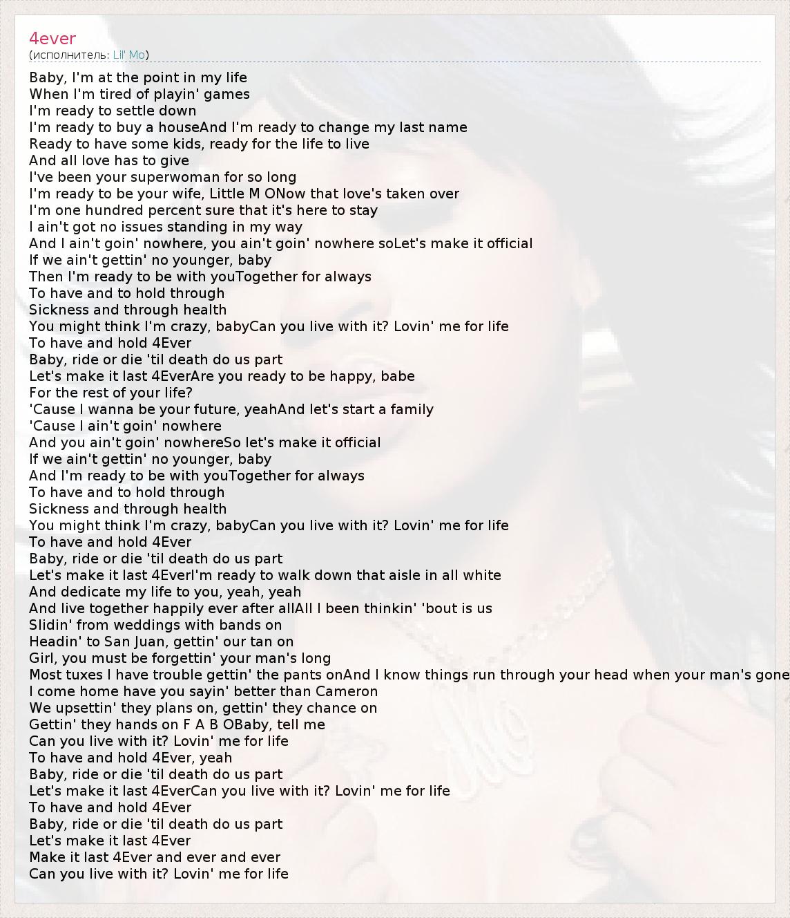 Baby, I'm at the point in my life When I'm tired of playin' games I'm ready to settle down I'm ready to buy a houseAnd I'm ready to change my last name Ready to have some kids, ready for the life to live And all love has to give I've been your superwoman for so long I'm ready to be your wife, Little M ONow that love's taken over I'm one hundred percent sure that it's here to stay I ain't got no issues standing in my way And I ain't goin' nowhere, you ain't goin' nowhere soLet's make it official If we ain't gettin' no younger, baby Then I'm ready to be with youTogether for always To have and to hold through Sickness and through health You might think I'm crazy, babyCan you live with it? Lovin' me for life To have and hold 4Ever Baby, ride or die 'til death do us part Let's make it last 4EverAre you ready to be happy, babe For the rest of your life? 'Cause I wanna be your future, yeahAnd let's start a family 'Cause I ain't goin' nowhere And you ain't goin' nowhereSo let's make it official If we ain't gettin' no younger, baby And I'm ready to be with youTogether for always To have and to hold through Sickness and through health You might think I'm crazy, babyCan you live with it? Lovin' me for life To have and hold 4Ever Baby, ride or die 'til death do us part Let's make it last 4EverI'm ready to walk down that aisle in all white And dedicate my life to you, yeah, yeah And live together happily ever after allAll I been thinkin' 'bout is us Slidin' from weddings with bands on Headin' to San Juan, gettin' our tan on Girl, you must be forgettin' your man's long Most tuxes I have trouble gettin' the pants onAnd I know things run through your head when your man's gone I come home have you sayin' better than Cameron We upsettin' they plans on, gettin' they chance on Gettin' they hands on F A B OBaby, tell me Can you live with it? Lovin' me for life To have and hold 4Ever, yeah Baby, ride or die 'til death do us part Let's make it last 4EverCan you live with it? Lovin' me for life To have and hold 4Ever Baby, ride or die 'til death do us part Let's make it last 4Ever Make it last 4Ever and ever and ever Can you live with it? Lovin' me for life
