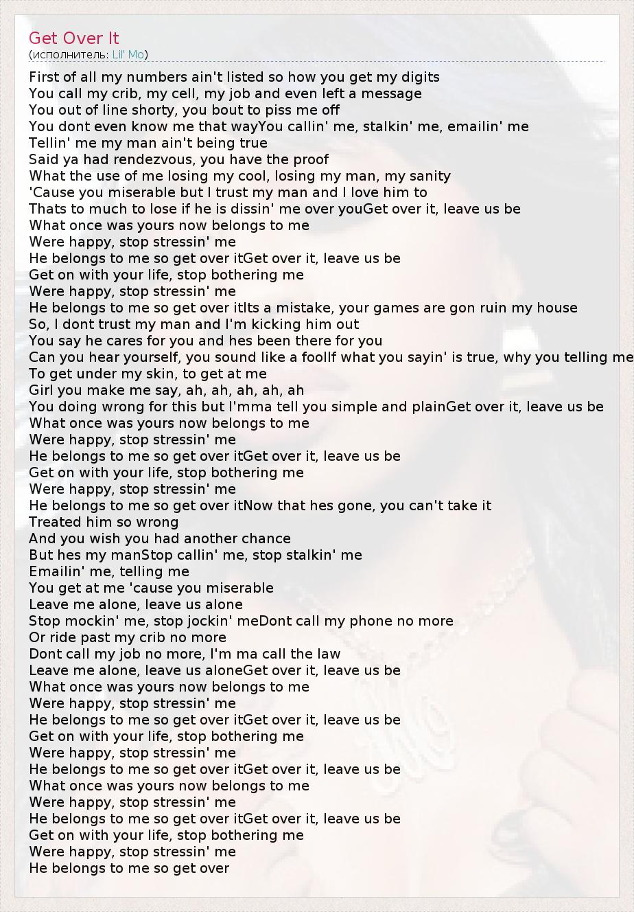 First of all my numbers ain't listed so how you get my digits You call my crib, my cell, my job and even left a message You out of line shorty, you bout to piss me off You dont even know me that wayYou callin' me, stalkin' me, emailin' me Tellin' me my man ain't being true Said ya had rendezvous, you have the proof What the use of me losing my cool, losing my man, my sanity 'Cause you miserable but I trust my man and I love him to Thats to much to lose if he is dissin' me over youGet over it, leave us be What once was yours now belongs to me Were happy, stop stressin' me He belongs to me so get over itGet over it, leave us be Get on with your life, stop bothering me Were happy, stop stressin' me He belongs to me so get over itIts a mistake, your games are gon ruin my house So, I dont trust my man and I'm kicking him out You say he cares for you and hes been there for you Can you hear yourself, you sound like a foolIf what you sayin' is true, why you telling me To get under my skin, to get at me Girl you make me say, ah, ah, ah, ah, ah You doing wrong for this but I'mma tell you simple and plainGet over it, leave us be What once was yours now belongs to me Were happy, stop stressin' me He belongs to me so get over itGet over it, leave us be Get on with your life, stop bothering me Were happy, stop stressin' me He belongs to me so get over itNow that hes gone, you can't take it Treated him so wrong And you wish you had another chance But hes my manStop callin' me, stop stalkin' me Emailin' me, telling me You get at me 'cause you miserable Leave me alone, leave us alone Stop mockin' me, stop jockin' meDont call my phone no more Or ride past my crib no more Dont call my job no more, I'm ma call the law Leave me alone, leave us aloneGet over it, leave us be What once was yours now belongs to me Were happy, stop stressin' me He belongs to me so get over itGet over it, leave us be Get on with your life, stop bothering me Were happy, stop stressin' me He belongs to me so get over itGet over it, leave us be What once was yours now belongs to me Were happy, stop stressin' me He belongs to me so get over itGet over it, leave us be Get on with your life, stop bothering me Were happy, stop stressin' me He belongs to me so get over