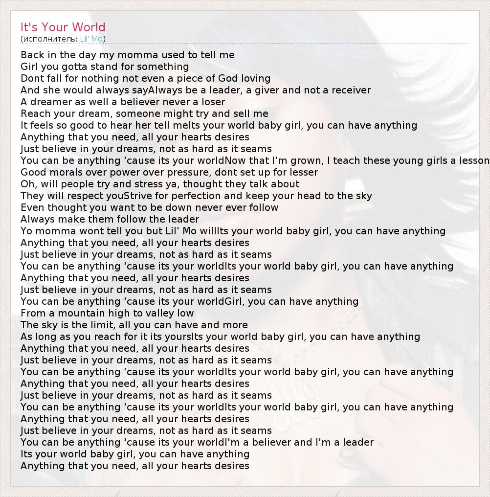 Back in the day my momma used to tell me Girl you gotta stand for something Dont fall for nothing not even a piece of God loving And she would always sayAlways be a leader, a giver and not a receiver A dreamer as well a believer never a loser Reach your dream, someone might try and sell me It feels so good to hear her tell meIts your world baby girl, you can have anything Anything that you need, all your hearts desires Just believe in your dreams, not as hard as it seams You can be anything 'cause its your worldNow that I'm grown, I teach these young girls a lesson Good morals over power over pressure, dont set up for lesser Oh, will people try and stress ya, thought they talk about They will respect youStrive for perfection and keep your head to the sky Even thought you want to be down never ever follow Always make them follow the leader Yo momma wont tell you but Lil' Mo willIts your world baby girl, you can have anything Anything that you need, all your hearts desires Just believe in your dreams, not as hard as it seams You can be anything 'cause its your worldIts your world baby girl, you can have anything Anything that you need, all your hearts desires Just believe in your dreams, not as hard as it seams You can be anything 'cause its your worldGirl, you can have anything From a mountain high to valley low The sky is the limit, all you can have and more As long as you reach for it its yoursIts your world baby girl, you can have anything Anything that you need, all your hearts desires Just believe in your dreams, not as hard as it seams You can be anything 'cause its your worldIts your world baby girl, you can have anything Anything that you need, all your hearts desires Just believe in your dreams, not as hard as it seams You can be anything 'cause its your worldIts your world baby girl, you can have anything Anything that you need, all your hearts desires Just believe in your dreams, not as hard as it seams You can be anything 'cause its your worldI'm a believer and I'm a leader Its your world baby girl, you can have anything Anything that you need, all your hearts desires