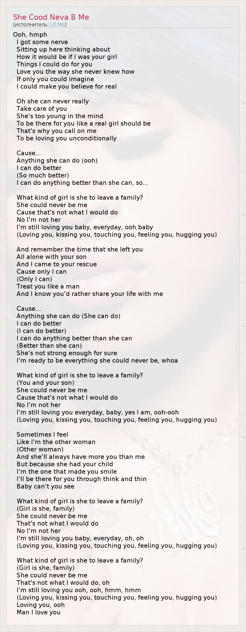 Ooh, hmph I got some nerve Sitting up here thinking about How it would be if I was your girl Things I could do for you Love you the way she never knew how If only you could imagine I could make you believe for real Oh she can never really Take care of you She's too young in the mind To be there for you like a real girl should be That's why you call on me To be loving you unconditionally Cause... Anything she can do (ooh) I can do better (So much better) I can do anything better than she can, so... What kind of girl is she to leave a family? She could never be me Cause that's not what I would do No I'm not her I'm still loving you baby, everyday, ooh baby (Loving you, kissing you, touching you, feeling you, hugging you) And remember the time that she left you All alone with your son And I came to your rescue Cause only I can (Only I can) Treat you like a man And I know you'd rather share your life with me Cause... Anything she can do (She can do) I can do better (I can do better) I can do anything better than she can (Better than she can) She's not strong enough for sure I'm ready to be everything she could never be, whoa What kind of girl is she to leave a family? (You and your son) She could never be me Cause that's not what I would do No I'm not her I'm still loving you everyday, baby, yes I am, ooh-ooh (Loving you, kissing you, touching you, feeling you, hugging you) Sometimes I feel Like I'm the other woman (Other woman) And she'll always have more you than me But because she had your child I'm the one that made you smile I'll be there for you through think and thin Baby can't you see What kind of girl is she to leave a family? (Girl is she, family) She could never be me That's not what I would do No I'm not her I'm still loving you baby, everyday, oh, oh (Loving you, kissing you, touching you, feeling you, hugging you) What kind of girl is she to leave a family? (Girl is she, family) She could never be me That's not what I would do, oh I'm still loving you ooh, ooh, hmm, hmm (Loving you, kissing you, touching you, feeling you, hugging you) Loving you, ooh Man I love you