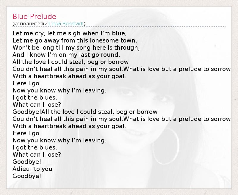 Let me cry, let me sigh when I'm blue, Let me go away from this lonesome town, Won't be long till my song here is through, And I know I'm on my last go round. All the love I could steal, beg or borrow Couldn't heal all this pain in my soul.What is love but a prelude to sorrow With a heartbreak ahead as your goal. Here I go Now you know why I'm leaving. I got the blues. What can I lose? Goodbye!All the love I could steal, beg or borrow Couldn't heal all this pain in my soul.What is love but a prelude to sorrow With a heartbreak ahead as your goal. Here I go Now you know why I'm leaving. I got the blues. What can I lose? Goodbye! Adieu! to you Goodbye!