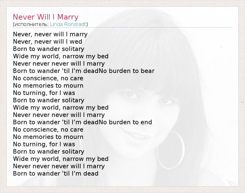 Never, never will I marry Never, never will I wed Born to wander solitary Wide my world, narrow my bed Never never never will I marry Born to wander 'til I'm deadNo burden to bear No conscience, no care No memories to mourn No turning, for I was Born to wander solitary Wide my world, narrow my bed Never never never will I marry Born to wander 'til I'm deadNo burden to end No conscience, no care No memories to mourn No turning, for I was Born to wander solitary Wide my world, narrow my bed Never never never will I marry Born to wander 'til I'm dead