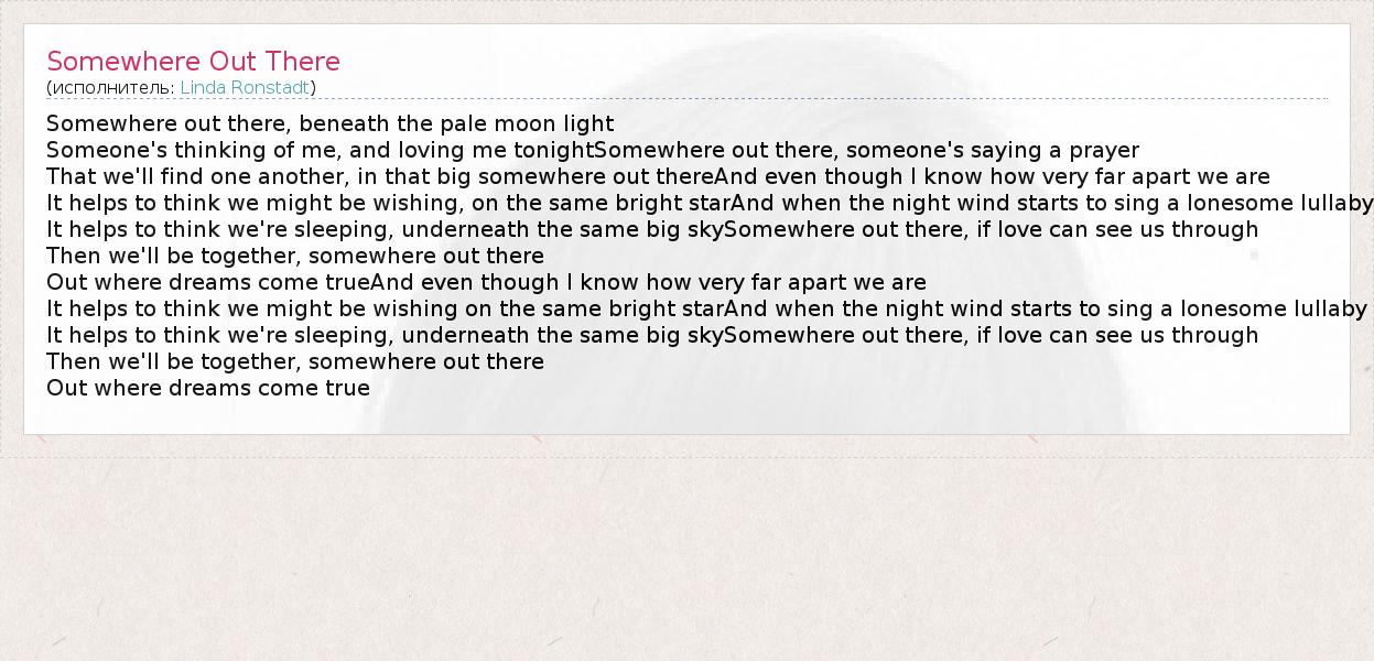 Somewhere out there, beneath the pale moon light Someone's thinking of me, and loving me tonightSomewhere out there, someone's saying a prayer That we'll find one another, in that big somewhere out thereAnd even though I know how very far apart we are It helps to think we might be wishing, on the same bright starAnd when the night wind starts to sing a lonesome lullaby It helps to think we're sleeping, underneath the same big skySomewhere out there, if love can see us through Then we'll be together, somewhere out there Out where dreams come trueAnd even though I know how very far apart we are It helps to think we might be wishing on the same bright starAnd when the night wind starts to sing a lonesome lullaby It helps to think we're sleeping, underneath the same big skySomewhere out there, if love can see us through Then we'll be together, somewhere out there Out where dreams come true