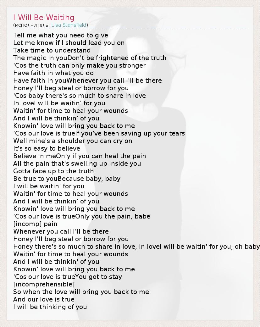 Tell me what you need to give Let me know if I should lead you on Take time to understand The magic in youDon't be frightened of the truth 'Cos the truth can only make you stronger Have faith in what you do Have faith in youWhenever you call I'll be there Honey I'll beg steal or borrow for you 'Cos baby there's so much to share in love In loveI will be waitin' for you Waitin' for time to heal your wounds And I will be thinkin' of you Knowin' love will bring you back to me 'Cos our love is trueIf you've been saving up your tears Well mine's a shoulder you can cry on It's so easy to believe Believe in meOnly if you can heal the pain All the pain that's swelling up inside you Gotta face up to the truth Be true to youBecause baby, baby I will be waitin' for you Waitin' for time to heal your wounds And I will be thinkin' of you Knowin' love will bring you back to me 'Cos our love is trueOnly you the pain, babe [incomp] pain Whenever you call I'll be there Honey I'll beg steal or borrow for you Honey there's so much to share in love, in loveI will be waitin' for you, oh baby Waitin' for time to heal your wounds And I will be thinkin' of you Knowin' love will bring you back to me 'Cos our love is trueYou got to stay [incomprehensible] So when the love will bring you back to me And our love is true I will be thinking of you