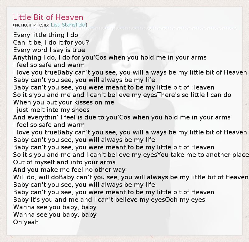 Every little thing I do Can it be, I do it for you? Every word I say is true Anything I do, I do for you'Cos when you hold me in your arms I feel so safe and warm I love you trueBaby can't you see, you will always be my little bit of Heaven Baby can't you see, you will always be my life Baby can't you see, you were meant to be my little bit of Heaven So it's you and me and I can't believe my eyesThere's so little I can do When you put your kisses on me I just melt into my shoes And everythin' I feel is due to you'Cos when you hold me in your arms I feel so safe and warm I love you trueBaby can't you see, you will always be my little bit of Heaven Baby can't you see, you will always be my life Baby can't you see, you were meant to be my little bit of Heaven So it's you and me and I can't believe my eyesYou take me to another place Out of myself and into your arms And you make me feel no other way Will do, will doBaby can't you see, you will always be my little bit of Heaven Baby can't you see, you will always be my life Baby can't you see, you were meant to be my little bit of Heaven Baby it's you and me and I can't believe my eyesOoh my eyes Wanna see you baby, baby Wanna see you baby, baby Oh yeah