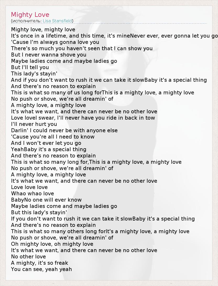Mighty love, mighty love It's once in a lifetime, and this time, it's mineNever ever, ever gonna let you go 'Cause I'm always gonna love you There's so much you haven't seen that I can show you But I never wanna shove you Maybe ladies come and maybe ladies go But I'll tell you This lady's stayin' And if you don't want to rush it we can take it slowBaby it's a special thing And there's no reason to explain This is what so many of us long forThis is a mighty love, a mighty love No push or shove, we're all dreamin' of A mighty love, a mighty love It's what we want, and there can never be no other love Love loveI swear, I'll never have you ride in back in tow I'll never hurt you Darlin' I could never be with anyone else 'Cause you're all I need to know And I won't ever let you go YeahBaby it's a special thing And there's no reason to explain This is what so many long for,This is a mighty love, a mighty love No push or shove, we're all dreamin' of A mighty love, a mighty love It's what we want, and there can never be no other love Love love love Whao whao love BabyNo one will ever know Maybe ladies come and maybe ladies go But this lady's stayin' If you don't want to rush it we can take it slowBaby it's a special thing And there's no reason to explain This is what so many others long forIt's a mighty love, a mighty love No push or shove, we're all dreamin' of Oh mighty love, oh mighty love It's what we want, and there can never be no other love No other love A mighty, it's so freak You can see, yeah yeah