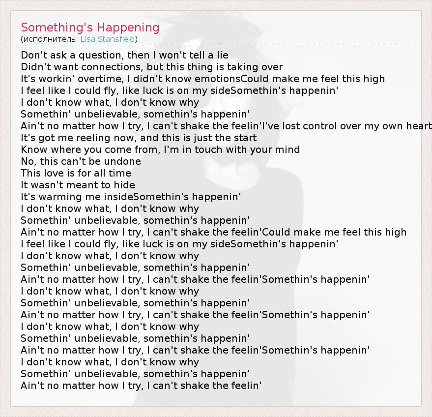 Don't ask a question, then I won't tell a lie Didn't want connections, but this thing is taking over It's workin' overtime, I didn't know emotionsCould make me feel this high I feel like I could fly, like luck is on my sideSomethin's happenin' I don't know what, I don't know why Somethin' unbelievable, somethin's happenin' Ain't no matter how I try, I can't shake the feelin'I've lost control over my own heart It's got me reeling now, and this is just the start Know where you come from, I'm in touch with your mind No, this can't be undone This love is for all time It wasn't meant to hide It's warming me insideSomethin's happenin' I don't know what, I don't know why Somethin' unbelievable, somethin's happenin' Ain't no matter how I try, I can't shake the feelin'Could make me feel this high I feel like I could fly, like luck is on my sideSomethin's happenin' I don't know what, I don't know why Somethin' unbelievable, somethin's happenin' Ain't no matter how I try, I can't shake the feelin'Somethin's happenin' I don't know what, I don't know why Somethin' unbelievable, somethin's happenin' Ain't no matter how I try, I can't shake the feelin'Somethin's happenin' I don't know what, I don't know why Somethin' unbelievable, somethin's happenin' Ain't no matter how I try, I can't shake the feelin'Somethin's happenin' I don't know what, I don't know why Somethin' unbelievable, somethin's happenin' Ain't no matter how I try, I can't shake the feelin'