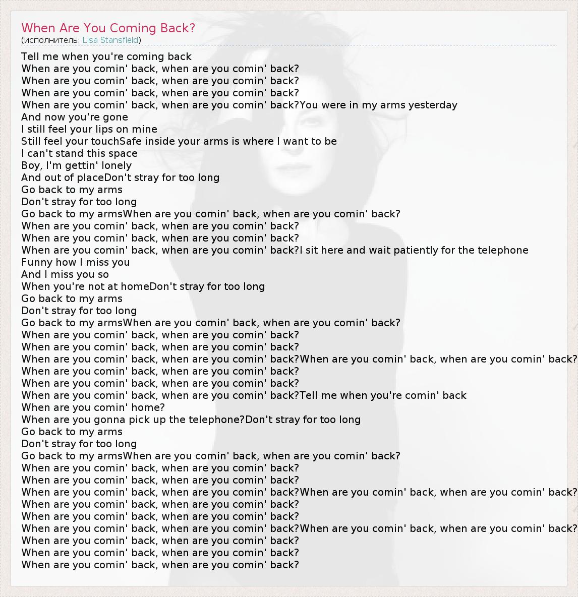 When are you comin' back, when are you comin' back?When are you comin' back, when are you comin' back?