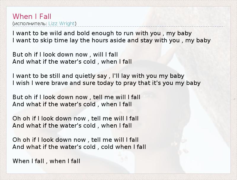 I want to be wild and bold enough to run with you , my baby I want to skip time lay the hours aside and stay with you , my baby But oh if I look down now , will I fall And what if the water's cold , when I fall I want to be still and quietly say , I'll lay with you my baby I wish I were brave and sure today to pray that it's you my baby But oh if I look down now , tell me will I fall And what if the water's cold , when I fall Oh oh if I look down now , tell me will I fall And what if the water's cold , when I fall Oh oh if I look down now , tell me will I fall And what if the water's cold , cold when I fall When I fall , when I fall