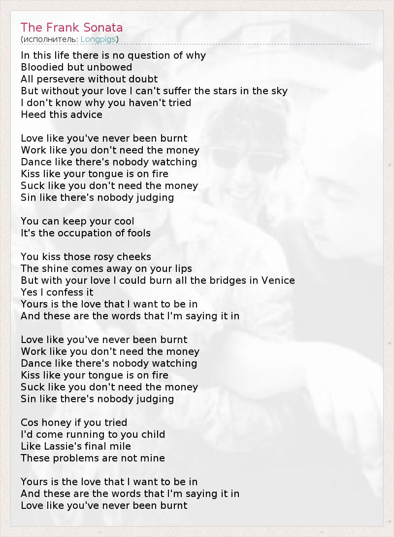 In this life there is no question of why Bloodied but unbowed All persevere without doubt But without your love I can't suffer the stars in the sky I don't know why you haven't tried Heed this advice Love like you've never been burnt Work like you don't need the money Dance like there's nobody watching Kiss like your tongue is on fire Suck like you don't need the money Sin like there's nobody judging You can keep your cool It's the occupation of fools You kiss those rosy cheeks The shine comes away on your lips But with your love I could burn all the bridges in Venice Yes I confess it Yours is the love that I want to be in And these are the words that I'm saying it in Love like you've never been burnt Work like you don't need the money Dance like there's nobody watching Kiss like your tongue is on fire Suck like you don't need the money Sin like there's nobody judging Cos honey if you tried I'd come running to you child Like Lassie's final mile These problems are not mine Yours is the love that I want to be in And these are the words that I'm saying it in Love like you've never been burnt