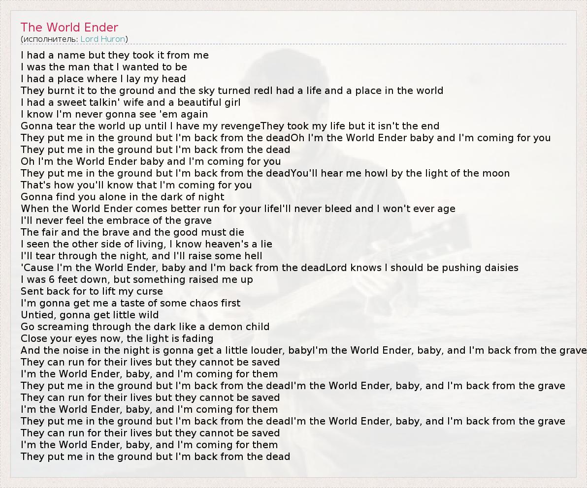 They put me in the ground but I'm back from the deadOh I'm the World Ender baby and I'm coming for you