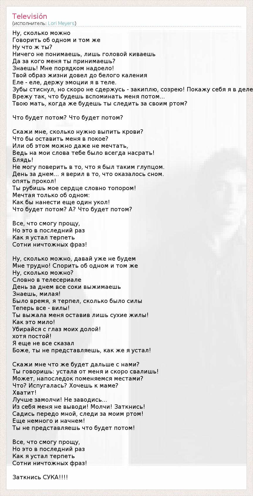 Ну, сколько можно Говорить об одном и том же Ну что ж ты? Ничего не понимаешь, лишь головой киваешь Да за кого меня ты принимаешь? Знаешь! Мне порядком надоело! Твой образ жизни довел до белого каления Еле - еле, держу эмоции я в теле. Зубы стиснул, но скоро не сдержусь - закиплю, созрею! Покажу себя я в деле Врежу так, что будешь вспоминать меня потом... Твою мать, когда же будешь ты следить за своим ртом? Что будет потом? Что будет потом? Скажи мне, сколько нужно выпить крови? Что бы оставить меня в покое? Или об этом можно даже не мечтать, Ведь на мои слова тебе было всегда насрать! Блядь! Не могу поверить в то, что я был таким глупцом. День за днем... я верил в то, что оказалось сном. опять прокол! Ты рубишь мое сердце словно топором! Мечтая только об одном: Как бы нанести еще один укол! Что будет потом? А? Что будет потом? Все, что смогу прощу, Но это в последний раз Как я устал терпеть Сотни ничтожных фраз! Ну, сколько можно, давай уже не будем Мне трудно! Спорить об одном и том же Ну, сколько можно? Словно в телесериале День за днем все соки выжимаешь Знаешь, милая! Было время, я терпел, сколько было силы Теперь все - вилы! Ты выжала меня оставив лишь сухие жилы! Как это мило! Убирайся с глаз моих долой! хотя постой! Я еще не все сказал Боже, ты не представляешь, как же я устал! Скажи мне что же будет дальше с нами? Ты говоришь: устала от меня и скоро свалишь! Может, напоследок поменяемся местами? Что? Испугалась? Хочешь к маме? Хватит! Лучше замолчи! Не заводись... Из себя меня не выводи! Молчи! Заткнись! Садись передо мной, следи за моим ртом! Еще немного и начнем! Ты не представляешь что будет потом! Все, что смогу прощу, Но это в последний раз Как я устал терпеть Сотни ничтожных фраз! Заткнись СУКА!!!!