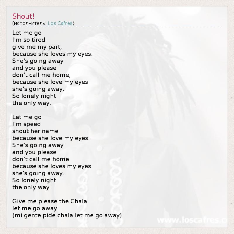 Let me go I'm so tired give me my part, because she loves my eyes. She's going away and you please don't call me home, because she love my eyes she's going away. So lonely night the only way. Let me go I'm speed shout her name because she love my eyes. She's going away and you please don't call me home because she loves my eyes she's going away. So lonely night the only way. Give me please the Chala let me go away (mi gente pide chala let me go away)