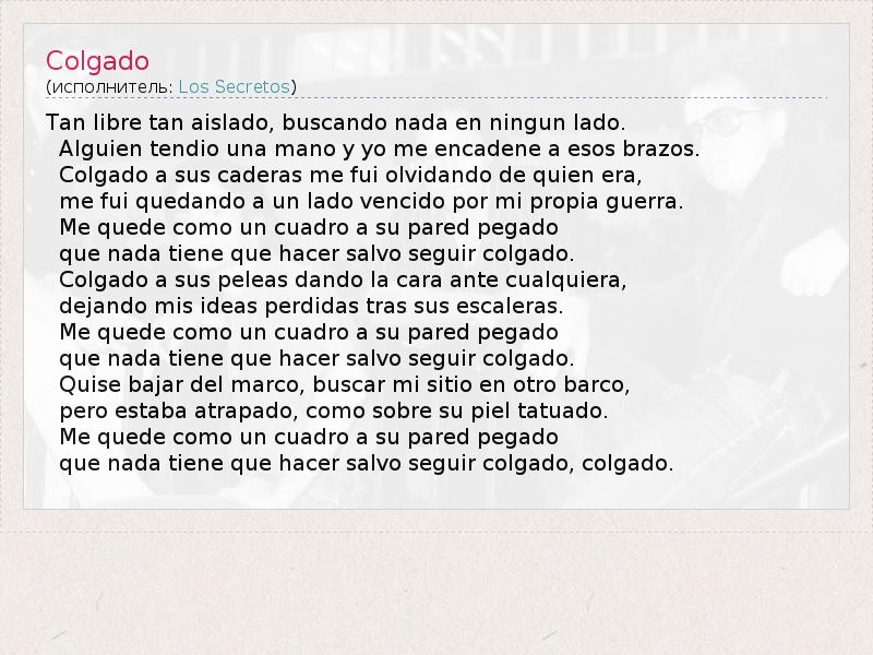 Tan libre tan aislado, buscando nada en ningun lado. Alguien tendio una mano y yo me encadene a esos brazos. Colgado a sus caderas me fui olvidando de quien era, me fui quedando a un lado vencido por mi propia guerra. Me quede como un cuadro a su pared pegado que nada tiene que hacer salvo seguir colgado. Colgado a sus peleas dando la cara ante cualquiera, dejando mis ideas perdidas tras sus escaleras. Me quede como un cuadro a su pared pegado que nada tiene que hacer salvo seguir colgado. Quise bajar del marco, buscar mi sitio en otro barco, pero estaba atrapado, como sobre su piel tatuado. Me quede como un cuadro a su pared pegado que nada tiene que hacer salvo seguir colgado, colgado.