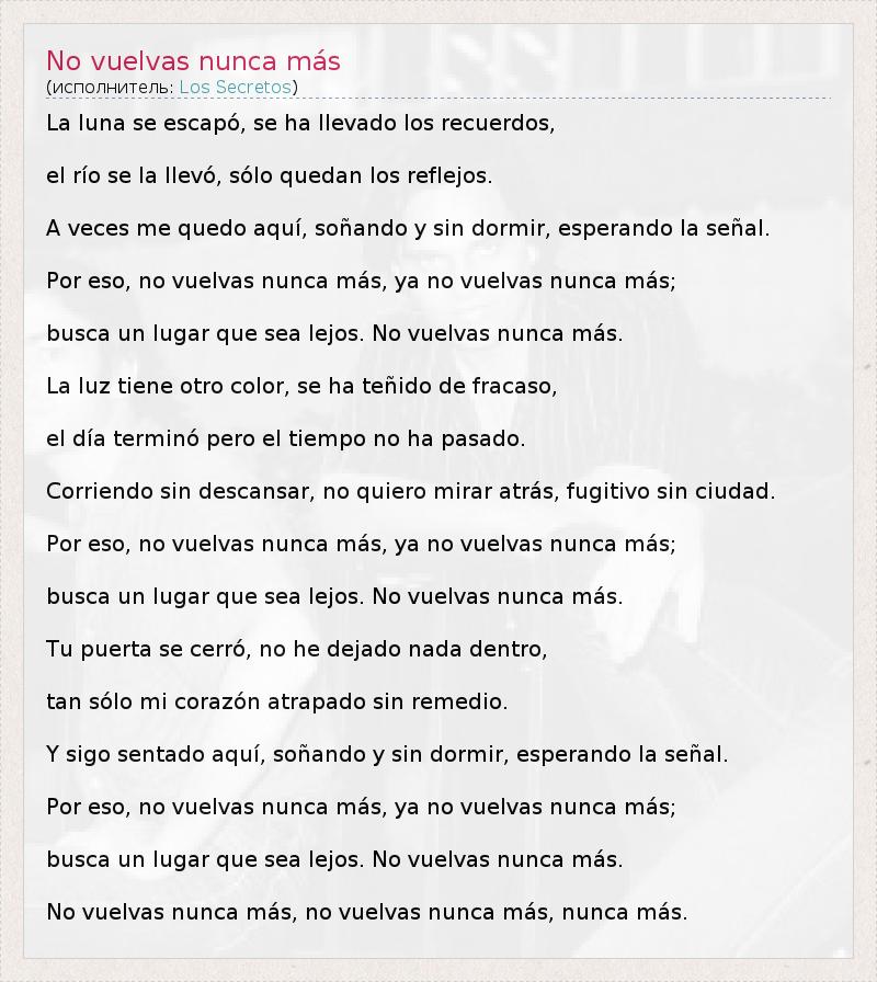 La luna se escapó, se ha llevado los recuerdos, el río se la llevó, sólo quedan los reflejos. A veces me quedo aquí, soñando y sin dormir, esperando la señal. Por eso, no vuelvas nunca más, ya no vuelvas nunca más; busca un lugar que sea lejos. No vuelvas nunca más. La luz tiene otro color, se ha teñido de fracaso, el día terminó pero el tiempo no ha pasado. Corriendo sin descansar, no quiero mirar atrás, fugitivo sin ciudad. Por eso, no vuelvas nunca más, ya no vuelvas nunca más; busca un lugar que sea lejos. No vuelvas nunca más. Tu puerta se cerró, no he dejado nada dentro, tan sólo mi corazón atrapado sin remedio. Y sigo sentado aquí, soñando y sin dormir, esperando la señal. Por eso, no vuelvas nunca más, ya no vuelvas nunca más; busca un lugar que sea lejos. No vuelvas nunca más. No vuelvas nunca más, no vuelvas nunca más, nunca más.