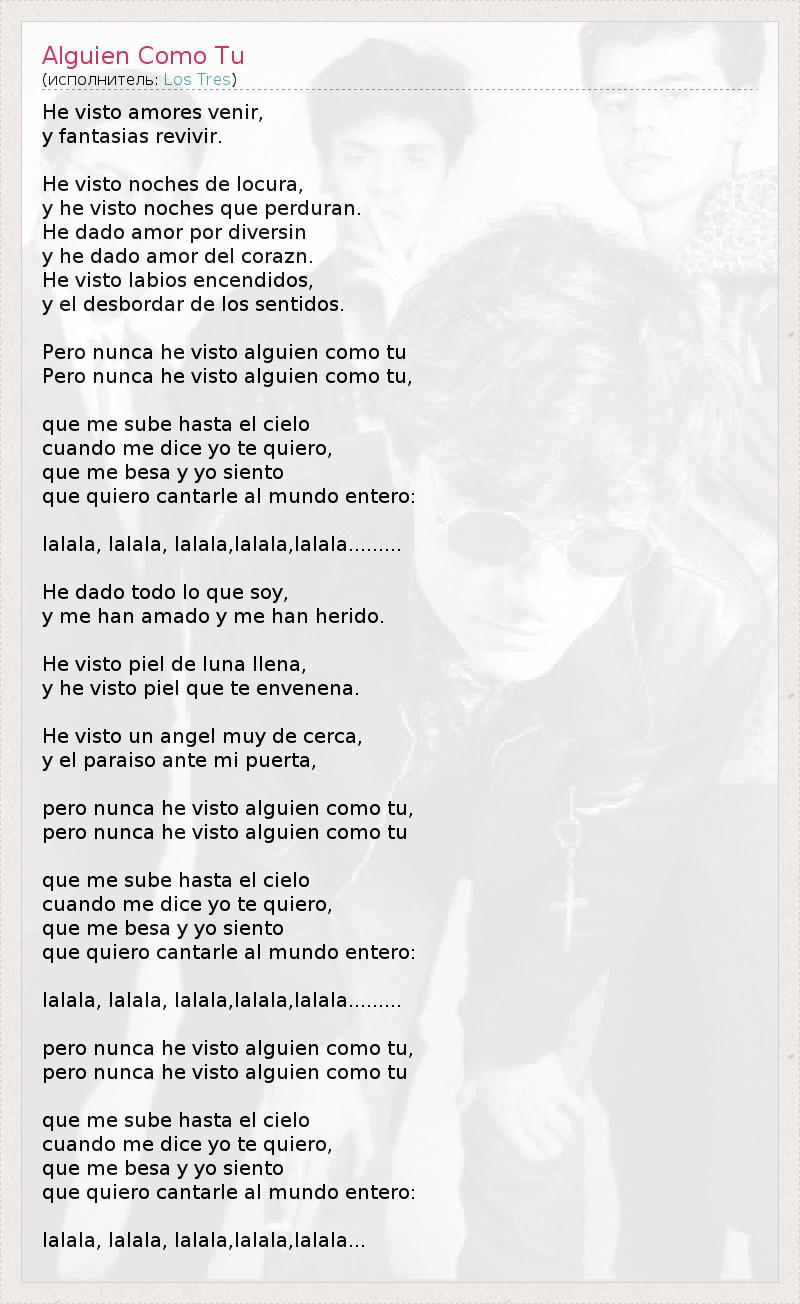 He visto amores venir, y fantasias revivir. He visto noches de locura, y he visto noches que perduran. He dado amor por diversin y he dado amor del corazn. He visto labios encendidos, y el desbordar de los sentidos. Pero nunca he visto alguien como tu Pero nunca he visto alguien como tu, que me sube hasta el cielo cuando me dice yo te quiero, que me besa y yo siento que quiero cantarle al mundo entero: lalala, lalala, lalala,lalala,lalala......... He dado todo lo que soy, y me han amado y me han herido. He visto piel de luna llena, y he visto piel que te envenena. He visto un angel muy de cerca, y el paraiso ante mi puerta, pero nunca he visto alguien como tu, pero nunca he visto alguien como tu que me sube hasta el cielo cuando me dice yo te quiero, que me besa y yo siento que quiero cantarle al mundo entero: lalala, lalala, lalala,lalala,lalala......... pero nunca he visto alguien como tu, pero nunca he visto alguien como tu que me sube hasta el cielo cuando me dice yo te quiero, que me besa y yo siento que quiero cantarle al mundo entero: lalala, lalala, lalala,lalala,lalala...