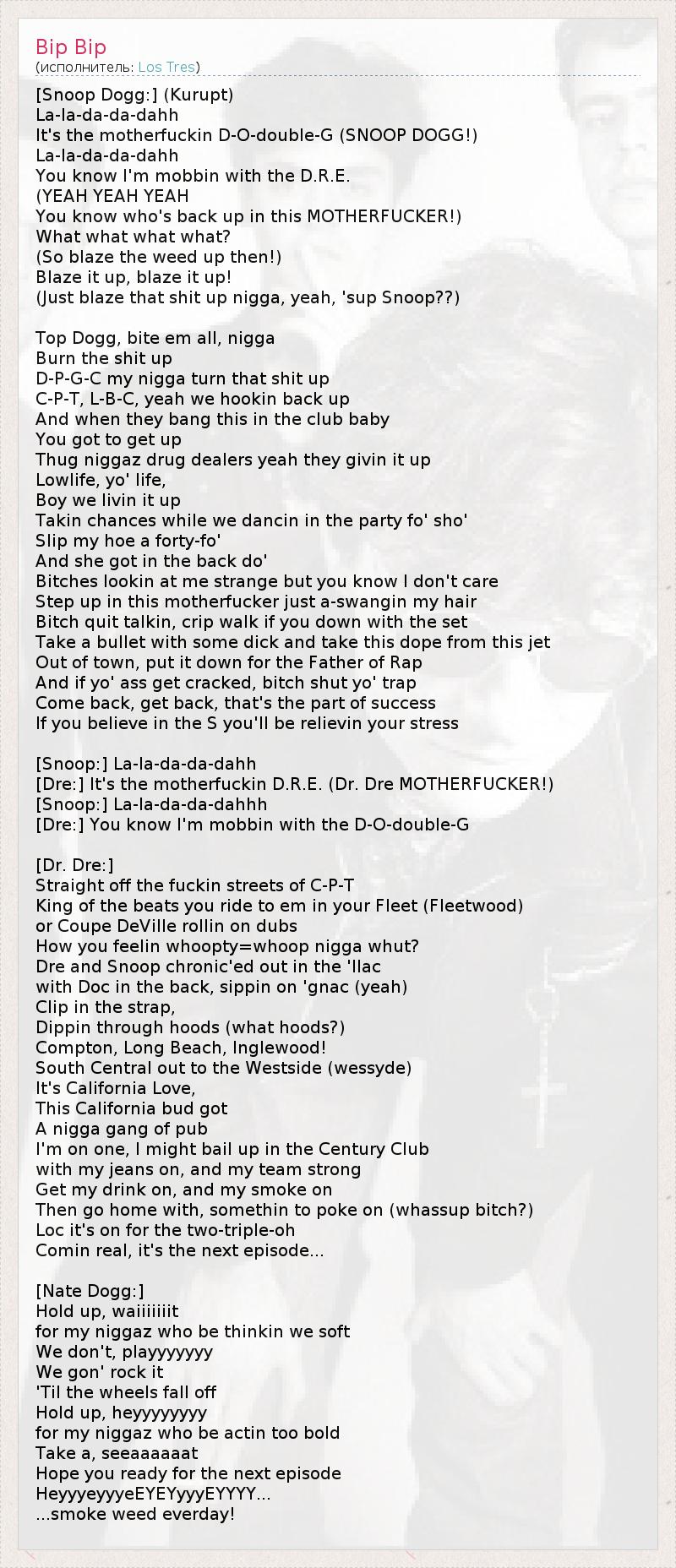 [Snoop Dogg:] (Kurupt) Ла-ла-да-да-даа, Это охренительный D-О-G-G (SNOOP DOGG!) Ла-ла-да-да-даа, Ты знаешь, что я тусуюсь 1 с D.R.E. (Да, да, да, Ты знаешь, кто подписывается за этого чувака!) Что, что, что, что? (В таком случае раскури дурь!) Раскуривай, раскуривай! (Просто раскуривай эту шнягу, нигер, да! Ну как, Snoop?) Самый главный Dogg, сделай их всех, нигер, Запали классную дурь, D-P-G-C 2, мой брат нигер, передай этот косячок, C-P-T 3, L-B-C 4, да, мы друг за друга горой, И когда они оттягиваются с дурью в клубе, детка, Тебе нужно расслабиться, Гангста-нигеры, наркодилеры, да, они расслабляются, Скудная жизнь, твоё существование, Мальчик, мы же полностью наслаждаемся 5 жизнью, Воспользуйся шансами, пока мы танцуем на вечеринке, точняк! Присунь моей шлюшке 44-колибровую пушку И она отхватит в задний проход, Суч*и пялятся на меня как-то странно, но ты знаешь, мне наплевать, Ввязывайся в это, придурок, я только помашу головой, Сучка, хватит болтать, танцуй crip 6, если ты в теме, Прими чек с кокаином вместе с чл*ном и получи свою дозу кетамина 7, Деревенщина, пресмыкайся перед Богом Рэпа, И если твоя задница была оприходованна 8, суч*ка, закрой свой рот, Возращайся, обратно сюда, это часть успеха, Если ты веришь в S, ты получишь облегчение от своего стресса. [Snoop:] Ла-ла-да-да-даа, [Dre:] Это охренительный D.R.E. (Dr. Dre, твою мать!) [Snoop:] Ла-ла-да-да-даа, [Dre:] Ты знаешь, что я тусуюсь с D-O-G-G. [Dr. Dre:] Любимые 9 охренительные улицы C-P-T 3, Король ритма, ты едешь к ним на своём Флитвуде 10 (Fleetwood), Или на Coupe DeVille 10 с 20 дюймовыми колёсами, Как ты себя чувствуешь, "бип-бип", нигер, чего? Dre и Snoop постоянно разъезжают в кадиллаке, Doc на заднем сиденье потягивает коньячок (да!) Патроны в пистолете, Углубляюсь в негритянские районы (какие негритянские районы?) Compton, Long Beach, Inglewood! Из South Central выезжаем в Westside (Весссайд). Это Калифорнийская любовь 11, Эту калифорнийскую марихуану предпочитает Банда нигеров публичного дома, Я под кайфом 12, я могу зажечь в Центральном Клубе, Одетый в джинсы, со своей сильной командой, Беру свою выпивку и свои косяки, Потом я иду домой потра*аться (что не так, суч*ка?) Запираюсь там с двумя-тремя-ох, Будет круто, это следующая серия... [Nate Dogg:] Тормози, подождиии Моих нигеров; кто считает, что мы слабоумные? Мы не шутиииим, Мы собираемся клубиться, До тех пор пока колёса тачки не отвалятся, Тормози, попривееетсвуй Моих нигеров; кто поступает слишком нагло! Присядь-ка! Надеюсь, ты готов для следующей серии! Пр-и-и-в-е-е-т! ... кури травку каждый день! 1 - mobbin - ехать или идти куда-нибудь большой группой, тусить. 2 - D-P-G-C - Dogg Pound Gangsta Clique - слан, состоящий из Snoop Dogg, Daz Dillinger, Kurupt, Nate Dogg, Soopafly и других. 3 - C-P-T - Compton, California - Комптон, штат Калифорния. 4 - L-B-C - Long Beach City - Лонг Бич, штат Калифорния. 5 - livin it up - расслабляться, отдыхать, наслаждаться жизнью. 6 - Crips - уличная банда, преступное сообщество в США, состоящее преимущественно из афроамериканцев. Для того, чтобы вступить в банду, парню нужно совершить преступление при свидетелях, а девушке вступить в половое сношение со старшими членами банды. В среде банды также возник знаменитый танец C-walk. 7 - jet - сленг. Название наркотика кетамина. 8 - get cracked - работать над чем-либо. 9 - Straight off - то, что очень нравится, что-то хорошее. 10 - Fleet, Coupe DeVille - модель кадиллака. 11 - California Love - известная песня 2Pac и Dr.Dre. 12 - on one - находиться под действием метамфетаминов