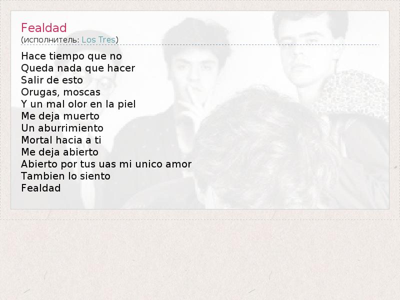 Hace tiempo que no Queda nada que hacer Salir de esto Orugas, moscas Y un mal olor en la piel Me deja muerto Un aburrimiento Mortal hacia a ti Me deja abierto Abierto por tus uas mi unico amor Tambien lo siento Fealdad