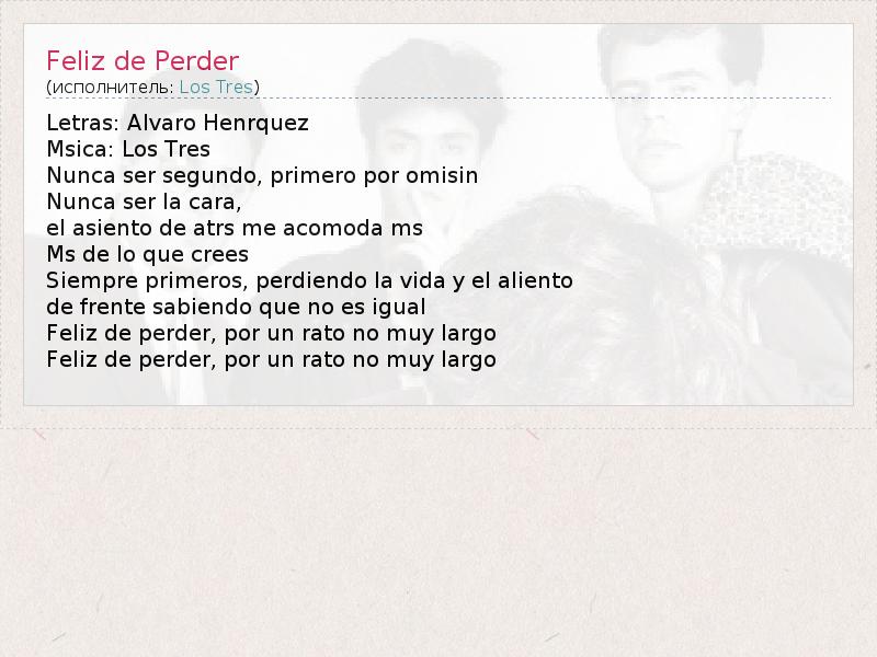 Letras: Alvaro Henrquez Msica: Los Tres Nunca ser segundo, primero por omisin Nunca ser la cara, el asiento de atrs me acomoda ms Ms de lo que crees Siempre primeros, perdiendo la vida y el aliento de frente sabiendo que no es igual Feliz de perder, por un rato no muy largo Feliz de perder, por un rato no muy largo