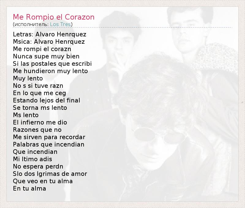 Letras: Alvaro Henrquez Msica: Alvaro Henrquez Me rompi el corazn Nunca supe muy bien Si las postales que escribi Me hundieron muy lento Muy lento No s si tuve razn En lo que me ceg Estando lejos del final Se torna ms lento Ms lento El infierno me dio Razones que no Me sirven para recordar Palabras que incendian Que incendian Mi ltimo adis No espera perdn Slo dos lgrimas de amor Que veo en tu alma En tu alma