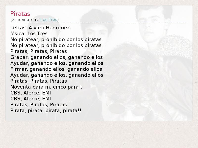 Letras: Alvaro Henrquez Msica: Los Tres No piratear, prohibido por los piratas No piratear, prohibido por los piratas Piratas, Piratas, Piratas Grabar, ganando ellos, ganando ellos Ayudar, ganando ellos, ganando ellos Firmar, ganando ellos, ganando ellos Ayudar, ganando ellos, ganando ellos Piratas, Piratas, Piratas Noventa para m, cinco para t CBS, Alerce, EMI CBS, Alerce, EMI Piratas, Piratas, Piratas Pirata, pirata, pirata, pirata!!
