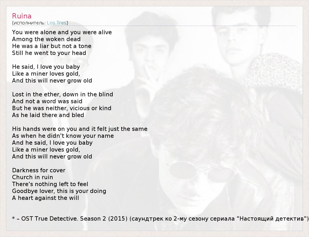 You were alone and you were alive Among the woken dead He was a liar but not a tone Still he went to your head He said, I love you baby Like a miner loves gold, And this will never grow old Lost in the ether, down in the blind And not a word was said But he was neither, vicious or kind As he laid there and bled His hands were on you and it felt just the same As when he didn't know your name And he said, I love you baby Like a miner loves gold, And this will never grow old Darkness for cover Church in ruin There's nothing left to feel Goodbye lover, this is your doing A heart against the will * – OST True Detective. Season 2 (2015) (саундтрек ко 2-му сезону сериала "Настоящий детектив")