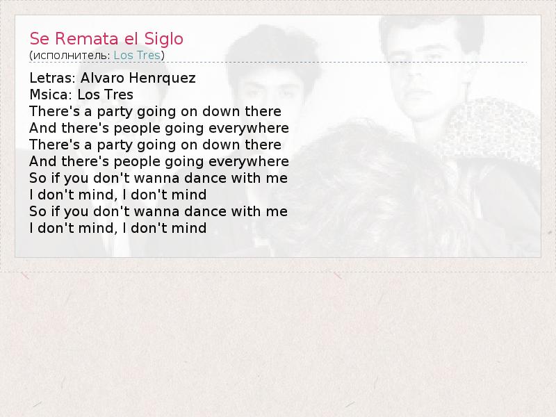Letras: Alvaro Henrquez Msica: Los Tres There's a party going on down there And there's people going everywhere There's a party going on down there And there's people going everywhere So if you don't wanna dance with me I don't mind, I don't mind So if you don't wanna dance with me I don't mind, I don't mind