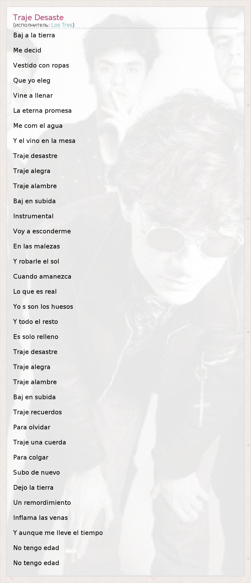 Baj a la tierra Me decid Vestido con ropas Que yo eleg Vine a llenar La eterna promesa Me com el agua Y el vino en la mesa Traje desastre Traje alegra Traje alambre Baj en subida Instrumental Voy a esconderme En las malezas Y robarle el sol Cuando amanezca Lo que es real Yo s son los huesos Y todo el resto Es solo relleno Traje desastre Traje alegra Traje alambre Baj en subida Traje recuerdos Para olvidar Traje una cuerda Para colgar Subo de nuevo Dejo la tierra Un remordimiento Inflama las venas Y aunque me lleve el tiempo No tengo edad No tengo edad