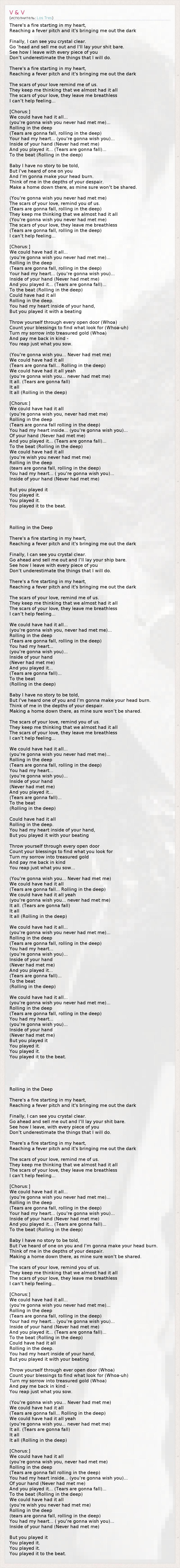 There's a fire starting in my heart, Reaching a fever pitch and it's bringing me out the dark Finally, I can see you crystal clear. Go 'head and sell me out and I'll lay your shit bare. See how I leave with every piece of you Don't underestimate the things that I will do. There's a fire starting in my heart, Reaching a fever pitch and it's bringing me out the dark The scars of your love remind me of us. They keep me thinking that we almost had it all The scars of your love, they leave me breathless I can't help feeling... [Chorus:] We could have had it all... (you're gonna wish you never had met me)... Rolling in the deep (Tears are gonna fall, rolling in the deep) Your had my heart... (you're gonna wish you)... Inside of your hand (Never had met me) And you played it... (Tears are gonna fall)... To the beat (Rolling in the deep) Baby I have no story to be told, But I've heard of one on you And I'm gonna make your head burn. Think of me in the depths of your despair. Make a home down there, as mine sure won't be shared. (You're gonna wish you never had met me) The scars of your love, remind you of us. (Tears are gonna fall, rolling in the deep) They keep me thinking that we almost had it all (You're gonna wish you never had met me) The scars of your love, they leave me breathless (Tears are gonna fall, rolling in the deep) I can't help feeling... [Chorus:] We could have had it all... (you're gonna wish you never had met me)... Rolling in the deep (Tears are gonna fall, rolling in the deep) Your had my heart... (you're gonna wish you)... Inside of your hand (Never had met me) And you played it... (Tears are gonna fall)... To the beat (Rolling in the deep) Could have had it all Rolling in the deep. You had my heart inside of your hand, But you played it with a beating Throw yourself through every open door (Whoa) Count your blessings to find what look for (Whoa-uh) Turn my sorrow into treasured gold (Whoa) And pay me back in kind - You reap just what you sow. (You're gonna wish you... Never had met me) We could have had it all (Tears are gonna fall... Rolling in the deep) We could have had it all yeah (you're gonna wish you... never had met me) It all. (Tears are gonna fall) It all It all (Rolling in the deep) [Chorus:] We could have had it all (you're gonna wish you, never had met me) Rolling in the deep (Tears are gonna fall rolling in the deep) You had my heart inside... (you're gonna wish you)... Of your hand (Never had met me) And you played it... (Tears are gonna fall)... To the beat (Rolling in the deep) We could have had it all (you're wish you never had met me) Rolling in the deep (tears are gonna fall, rolling in the deep) You had my heart... ( you're gonna wish you)... Inside of your hand (Never had met me) But you played it You played it. You played it. You played it to the beat. Rolling in the Deep There's a fire starting in my heart, Reaching a fever pitch and it's bringing me out the dark Finally, I can see you crystal clear. Go ahead and sell me out and I'll lay your ship bare. See how I leave with every piece of you Don't underestimate the things that I will do. There's a fire starting in my heart, Reaching a fever pitch and it's bringing me out the dark The scars of your love, remind me of us. They keep me thinking that we almost had it all The scars of your love, they leave me breathless I can't help feeling... We could have had it all... (you're gonna wish you, never had met me)... Rolling in the deep (Tears are gonna fall, rolling in the deep) You had my heart... (you're gonna wish you)... Inside of your hand (Never had met me) And you played it... (Tears are gonna fall)... To the beat (Rolling in the deep) Baby I have no story to be told, But I've heard one of you and I'm gonna make your head burn. Think of me in the depths of your despair. Making a home down there, as mine sure won't be shared. The scars of your love, remind you of us. They keep me thinking that we almost had it all The scars of your love, they leave me breathless I can't help feeling... We could have had it all... (you're gonna wish you never had met me)... Rolling in the deep (Tears are gonna fall, rolling in the deep) You had my heart... (you're gonna wish you)... Inside of your hand (Never had met me) And you played it... (Tears are gonna fall)... To the beat (Rolling in the deep) Could have had it all Rolling in the deep. You had my heart inside of your hand, But you played it with your beating Throw yourself through every open door Count your blessings to find what you look for Turn my sorrow into treasured gold And pay me back in kind You reap just what you sow... (You're gonna wish you... Never had met me) We could have had it all (Tears are gonna fall... Rolling in the deep) We could have had it all yeah (you're gonna wish you... never had met me) It all. (Tears are gonna fall) It all It all (Rolling in the deep) We could have had it all... (you're gonna wish you never had met me)... Rolling in the deep (Tears are gonna fall, rolling in the deep) You had my heart... (you're gonna wish you)... Inside of your hand (Never had met me) And you played it... (Tears are gonna fall)... To the beat (Rolling in the deep) We could have had it all... (you're gonna wish you never had met me)... Rolling in the deep (Tears are gonna fall, rolling in the deep) You had my heart... (you're gonna wish you)... Inside of your hand (Never had met me) But you played it You played it. You played it. You played it to the beat. Rolling in the Deep There's a fire starting in my heart, Reaching a fever pitch and it's bringing me out the dark Finally, I can see you crystal clear. Go ahead and sell me out and I'll lay your shit bare. See how I leave, with every piece of you Don't underestimate the things that I will do. There's a fire starting in my heart, Reaching a fever pitch and it's bringing me out the dark The scars of your love, remind me of us. They keep me thinking that we almost had it all The scars of your love