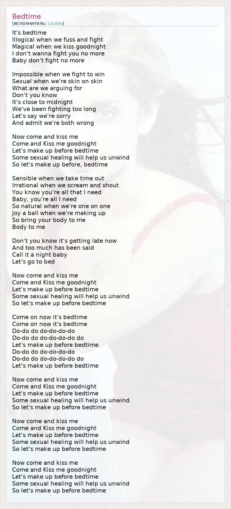It's bedtime Illogical when we fuss and fight Magical when we kiss goodnight I don't wanna fight you no more Baby don't fight no more Impossible when we fight to win Sexual when we're skin on skin What are we arguing for Don't you know It's close to midnight We've been fighting too long Let's say we're sorry And admit we're both wrong Now come and kiss me Come and Kiss me goodnight Let's make up before bedtime Some sexual healing will help us unwind So let's make up before, bedtime Sensible when we take time out Irrational when we scream and shout You know you're all that I need Baby, you're all I need So natural when we're one on one Joy a ball when we're making up So bring your body to me Body to me Don't you know it's getting late now And too much has been said Call it a night baby Let's go to bed Now come and kiss me Come and Kiss me goodnight Let's make up before bedtime Some sexual healing will help us unwind So let's make up before bedtime Come on now it's bedtime Come on now it's bedtime Do-do do do-do-do-do Do-do do do-do-do-do do Let's make up before bedtime Do-do do do-do-do-do Do-do do do-do-do-do do Let's make up before bedtime Now come and kiss me Come and Kiss me goodnight Let's make up before bedtime Some sexual healing will help us unwind So let's make up before bedtime Now come and kiss me Come and Kiss me goodnight Let's make up before bedtime Some sexual healing will help us unwind So let's make up before bedtime Now come and kiss me Come and Kiss me goodnight Let's make up before bedtime Some sexual healing will help us unwind So let's make up before bedtime