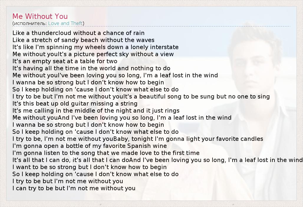 Like a thundercloud without a chance of rain Like a stretch of sandy beach without the waves It's like I'm spinning my wheels down a lonely interstate Me without youIt's a picture perfect sky without a view It's an empty seat at a table for two It's having all the time in the world and nothing to do Me without youI've been loving you so long, I'm a leaf lost in the wind I wanna be so strong but I don't know how to begin So I keep holding on 'cause I don't know what else to do I try to be but I'm not me without youIt's a beautiful song to be sung but no one to sing It's this beat up old guitar missing a string It's me calling in the middle of the night and it just rings Me without youAnd I've been loving you so long, I'm a leaf lost in the wind I wanna be so strong but I don't know how to begin So I keep holding on 'cause I don't know what else to do I try to be, I'm not me without youBaby, tonight I'm gonna light your favorite candles I'm gonna open a bottle of my favorite Spanish wine I'm gonna listen to the song that we made love to the first time It's all that I can do, it's all that I can doAnd I've been loving you so long, I'm a leaf lost in the wind I want to be so strong but I don't know how to begin So I keep holding on 'cause I don't know what else to do I try to be but I'm not me without you I can try to be but I'm not me without you