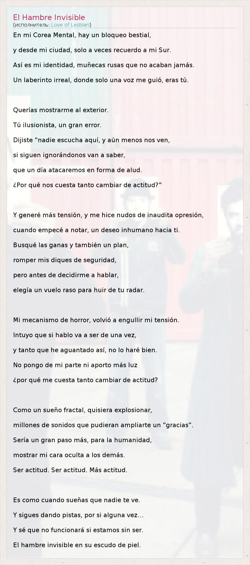 En mi Corea Mental, hay un bloqueo bestial, y desde mi ciudad, solo a veces recuerdo a mi Sur. Así es mi identidad, muñecas rusas que no acaban jamás. Un laberinto irreal, donde solo una voz me guió, eras tú. Querías mostrarme al exterior. Tú ilusionista, un gran error. Dijiste "nadie escucha aquí, y aún menos nos ven, si siguen ignorándonos van a saber, que un día atacaremos en forma de alud. ¿Por qué nos cuesta tanto cambiar de actitud?" Y generé más tensión, y me hice nudos de inaudita opresión, cuando empecé a notar, un deseo inhumano hacia ti. Busqué las ganas y también un plan, romper mis diques de seguridad, pero antes de decidirme a hablar, elegía un vuelo raso para huir de tu radar. Mi mecanismo de horror, volvió a engullir mi tensión. Intuyo que si hablo va a ser de una vez, y tanto que he aguantado así, no lo haré bien. No pongo de mi parte ni aporto más luz ¿por qué me cuesta tanto cambiar de actitud? Como un sueño fractal, quisiera explosionar, millones de sonidos que pudieran ampliarte un "gracias". Sería un gran paso más, para la humanidad, mostrar mi cara oculta a los demás. Ser actitud. Ser actitud. Más actitud. Es como cuando sueñas que nadie te ve. Y sigues dando pistas, por si alguna vez… Y sé que no funcionará si estamos sin ser. El hambre invisible en su escudo de piel.