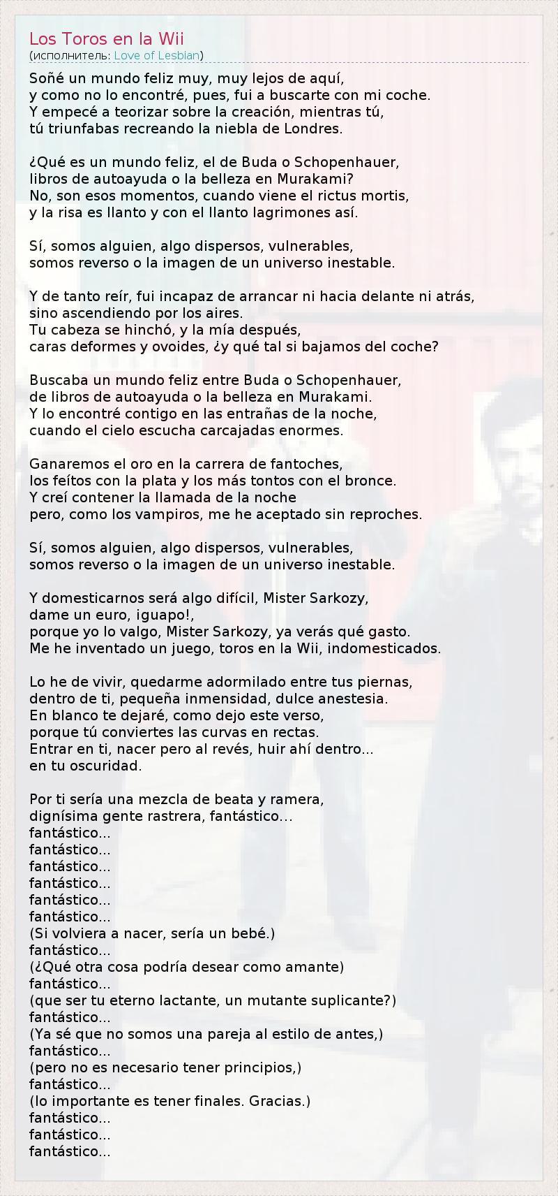 Это интересно:Love of Lesbian - испанская группа, исполняющая музыку в стиле поп-рок, инди-поп. Была образована в Барселоне в 1996 году. Первый выпущенный альбом - "Microscopic Movies", 1999 год. Члены группы - Santi Balmes, Julián Saldarriaga, Jordi Roig, Joan Ramon Planell, Oriol Bonet.После трех дисков, выпущенных на английском языке, Love of Lesbian решили исполнять песни на испанском, вследствие чего выпустили свои последние три диска на кастельяно.... продолжение