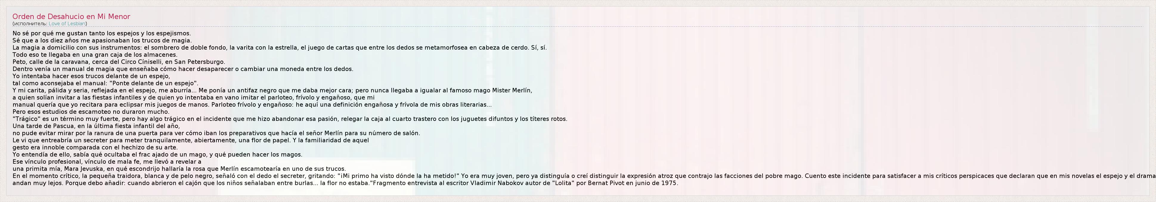 No sé por qué me gustan tanto los espejos y los espejismos. Sé que a los diez años me apasionaban los trucos de magia. La magia a domicilio con sus instrumentos: el sombrero de doble fondo, la varita con la estrella, el juego de cartas que entre los dedos se metamorfosea en cabeza de cerdo. Sí, sí. Todo eso te llegaba en una gran caja de los almacenes. Peto, calle de la caravana, cerca del Circo Cíniselli, en San Petersburgo. Dentro venía un manual de magia que enseñaba cómo hacer desaparecer o cambiar una moneda entre los dedos. Yo intentaba hacer esos trucos delante de un espejo, tal como aconsejaba el manual: "Ponte delante de un espejo". Y mi carita, pálida y seria, reflejada en el espejo, me aburría... Me ponía un antifaz negro que me daba mejor cara; pero nunca llegaba a igualar al famoso mago Mister Merlín, a quien solían invitar a las fiestas infantiles y de quien yo intentaba en vano imitar el parloteo, frívolo y engañoso, que mi manual quería que yo recitara para eclipsar mis juegos de manos. Parloteo frívolo y engañoso: he aquí una definición engañosa y frívola de mis obras literarias... Pero esos estudios de escamoteo no duraron mucho. "Trágico" es un término muy fuerte, pero hay algo trágico en el incidente que me hizo abandonar esa pasión, relegar la caja al cuarto trastero con los juguetes difuntos y los títeres rotos. Una tarde de Pascua, en la última fiesta infantil del año, no pude evitar mirar por la ranura de una puerta para ver cómo iban los preparativos que hacía el señor Merlín para su número de salón. Le vi que entreabría un secreter para meter tranquilamente, abiertamente, una flor de papel. Y la familiaridad de aquel gesto era innoble comparada con el hechizo de su arte. Yo entendía de ello, sabía qué ocultaba el frac ajado de un mago, y qué pueden hacer los magos. Ese vínculo profesional, vínculo de mala fe, me llevó a revelar a una primita mía, Mara Jevuska, en qué escondrijo hallaría la rosa que Merlín escamotearía en uno de sus trucos. En el momento crítico, la pequeña traidora, blanca y de pelo negro, señaló con el dedo el secreter, gritando: "¡Mi primo ha visto dónde la ha metido!" Yo era muy joven, pero ya distinguía o creí distinguir la expresión atroz que contrajo las facciones del pobre mago. Cuento este incidente para satisfacer a mis críticos perspicaces que declaran que en mis novelas el espejo y el drama andan muy lejos. Porque debo añadir: cuando abrieron el cajón que los niños señalaban entre burlas... la flor no estaba."Fragmento entrevista al escritor Vladimir Nabokov autor de "Lolita" por Bernat Pivot en junio de 1975.