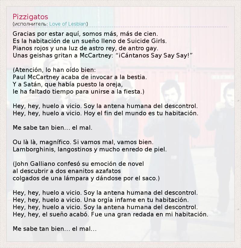 Это интересно:Love of Lesbian - испанская группа, исполняющая музыку в стиле поп-рок, инди-поп. Была образована в Барселоне в 1996 году. Первый выпущенный альбом - "Microscopic Movies", 1999 год. Члены группы - Santi Balmes, Julián Saldarriaga, Jordi Roig, Joan Ramon Planell, Oriol Bonet.После трех дисков, выпущенных на английском языке, Love of Lesbian решили исполнять песни на испанском, вследствие чего выпустили свои последние три диска на кастельяно.... продолжение